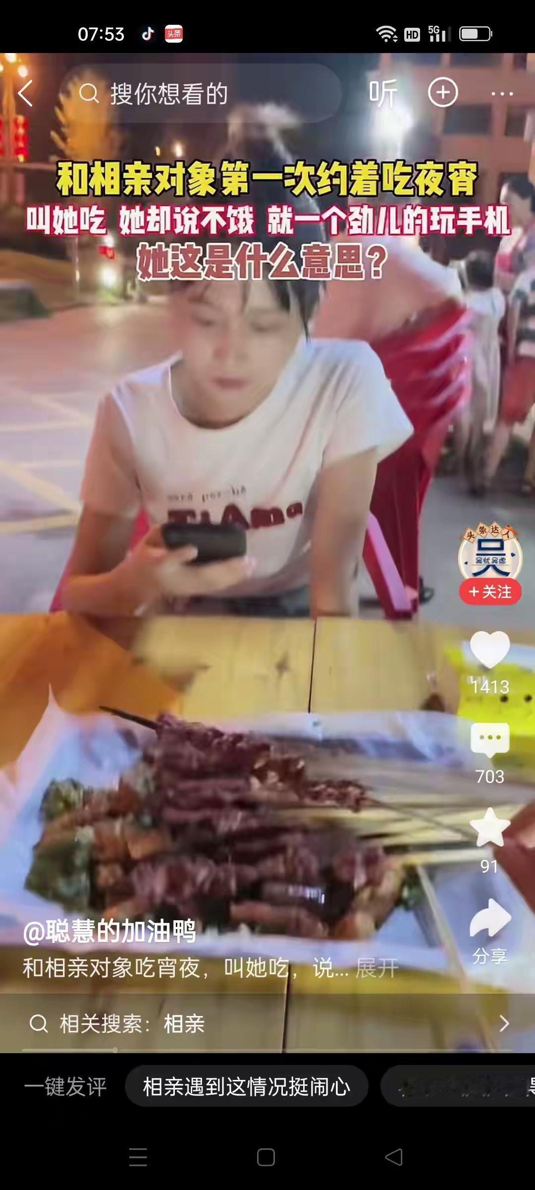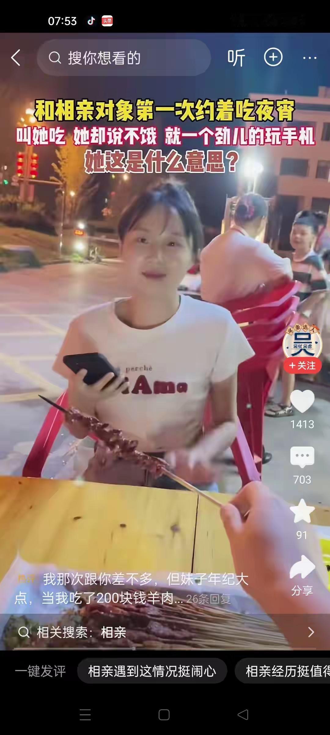 女子请相亲的女生吃烧烤。女生却一直玩手机。男生叫她吃,她说自己不饿,又开始一个劲地玩手机。她也不说话。男生受不了了,质问女生,你到底是啥意思?女生彻底摊牌了,我不是不饿。我是不想吃路边摊。 这是千金小姐还是哪家财阀的公主,家里有多少矿,平时家里都是山珍海味五星级米其林大厨做菜吗。刘嘉玲都在节目里说,她很喜欢去吃路边摊,你比刘嘉玲有钱? 钱是一方面,情商为人处世之道也不咋地,如果不喜欢这个人就随便说几句就走,如果觉得这个人可以聊,这些东西吃不私死人,怎么要一来带你去吃米其林才高兴?把别人当冤大头,有些人就是普通老百姓,可时时刻刻认为自己是世界中心!这是严重的低认知人群!尽量远离!