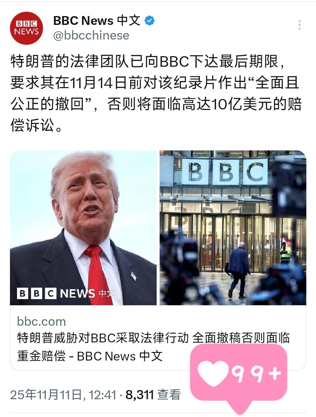 就在刚刚! 美国总统特朗普的法律团队宣布了! 11月11号,BBC中文网曝出的一条消息在网上引发了大讨论:美国总统特朗普的法律团队,给BBC下了最后通牒,要求他们在11月14号之前,把涉及特朗普的那部纪录片全面撤回,要是没做到,就得赔10亿美元。 这事看着是名人跟媒体的纠纷,其实背后藏着不少值得琢磨的问题,尤其是关于媒体该怎么守住自己的本分。 事情的来龙去脉并不复杂。这部引发争议的纪录片,被曝出制作时拼接了特朗普的演讲片段。 从BBC内部的备忘录来看,这种剪辑不是不小心剪错了,而是故意把原本完整的演讲拆开来重新组合,改变了原来的意思,目的就是误导观众,让大家产生不当的联想。 消息一出,舆论一下子就炸了,之后BBC的总裁和新闻主管都辞了职,但官方还是嘴硬,说自己对特朗普没有“系统性偏见”。 可特朗普没打算就这么算了。 他向来性格强硬,这次直接让法律团队出手,给出的3天期限一点商量的余地都没有。 10亿美元可不是小数目,就算是BBC这样有百年历史的国际大媒体,真要是打这场官司,不管最后赢没赢,不光是钱的损失,名声上也得受重创。 而且一旦闹上法庭,纪录片制作的更多细节可能都会被扒出来,到时候大家对BBC的信任度,恐怕会越来越低。 说到BBC,以前大家都觉得它是“客观、公正”的代名词,作为老牌国际媒体,它的报道曾经被很多人信服。 可这次为啥会出这种事? 其实这也不是BBC一家的问题,目前很多媒体都面临着同样的困境:大家都想赚流量、吸引更多人关注,有时候就慢慢把“真实”这个最基本的原则给忘了。 纪录片本来就该如实反映事实,可通过剪辑故意误导观众,说白了就是骗大家,这不仅是不尊重观众,更是丢了媒体该有的底线。 还有个让人疑惑的点,国际媒体常说自己“中立”,可实际情况真的是这样吗? BBC说自己没有“系统性偏见”,但不少网友都不买账。其实现在很多国际媒体,难免会受到地缘政治、意识形态这些因素的影响,报道的时候可能悄悄带了自己的立场。 这次拼接事件之所以让大家这么生气,就是因为这种“偏向”通过剪辑摆到了明面上,打破了大家对媒体“不偏不倚”的期待。 再说说特朗普这边,他这次的做法也让大家看到,公众人物遇到不实报道,不一定非要忍气吞声。 以前不少名人碰到媒体乱报道,要么觉得维权太麻烦,要么怕越闹越大,就选择沉默。 但特朗普直接用法律维权,这也给其他人提了个醒:不管是谁,名誉都受保护,遇到不实报道不用忍。 不过话说回来,公众人物维权也得有分寸,关键还是得靠事实说话,不能借着维权的名义压制正常的报道。 这场风波其实给所有媒体都提了个醒:媒体的立身之本就是真实。 目前信息传播越来越快,想吸引观众关注没问题,但不能为了流量就丢了底线。 不管是大媒体还是小平台,一旦让大家觉得你不真实、不可信,想再赢回大家的信任就难了。 而且媒体也该建立更严的内容审核机制,别再出现这种拼接剪辑误导人的情况。 目前距离11月14号的最后期限越来越近了,大家都在等着看BBC的选择:是乖乖撤片避免赔钱,还是硬着头皮跟特朗普打这场官司? 不管结果怎么样,这事都让大家重新关注到一个重要的问题:媒体到底该怎么平衡流量和真实? 只有守住了真实的底线,媒体才能走得长远。 这事的后续发展还不好说,但它给整个媒体行业带来的思考,肯定会持续很久。 位读者你们怎么看?欢迎在评论区讨论。