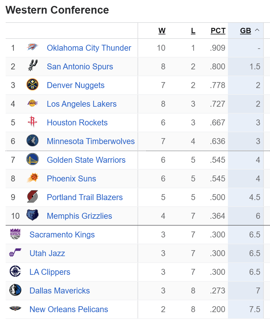 刺激的一天过后,湖人8胜3负西部第四,场均净胜分+1.6是西部前八中最少的。