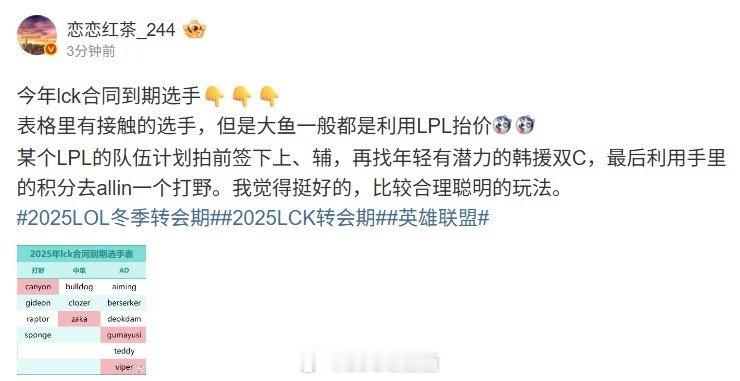 圈内人:有LPL队计划签上辅 找年轻有潜力的韩援双C 积分All in野圈内人发文,谈明年LPL竞拍模式下的战队:今年lck合同到期选手👇👇👇表格里有接触的选手,但是大鱼一般都是利用LPL抬价。某个LPL的队伍计划拍前签下上、辅,再找年轻有潜力的韩援双C,最后利用手里的积分去allin一个打野。我觉得挺好的,比较合理聪明的玩法。