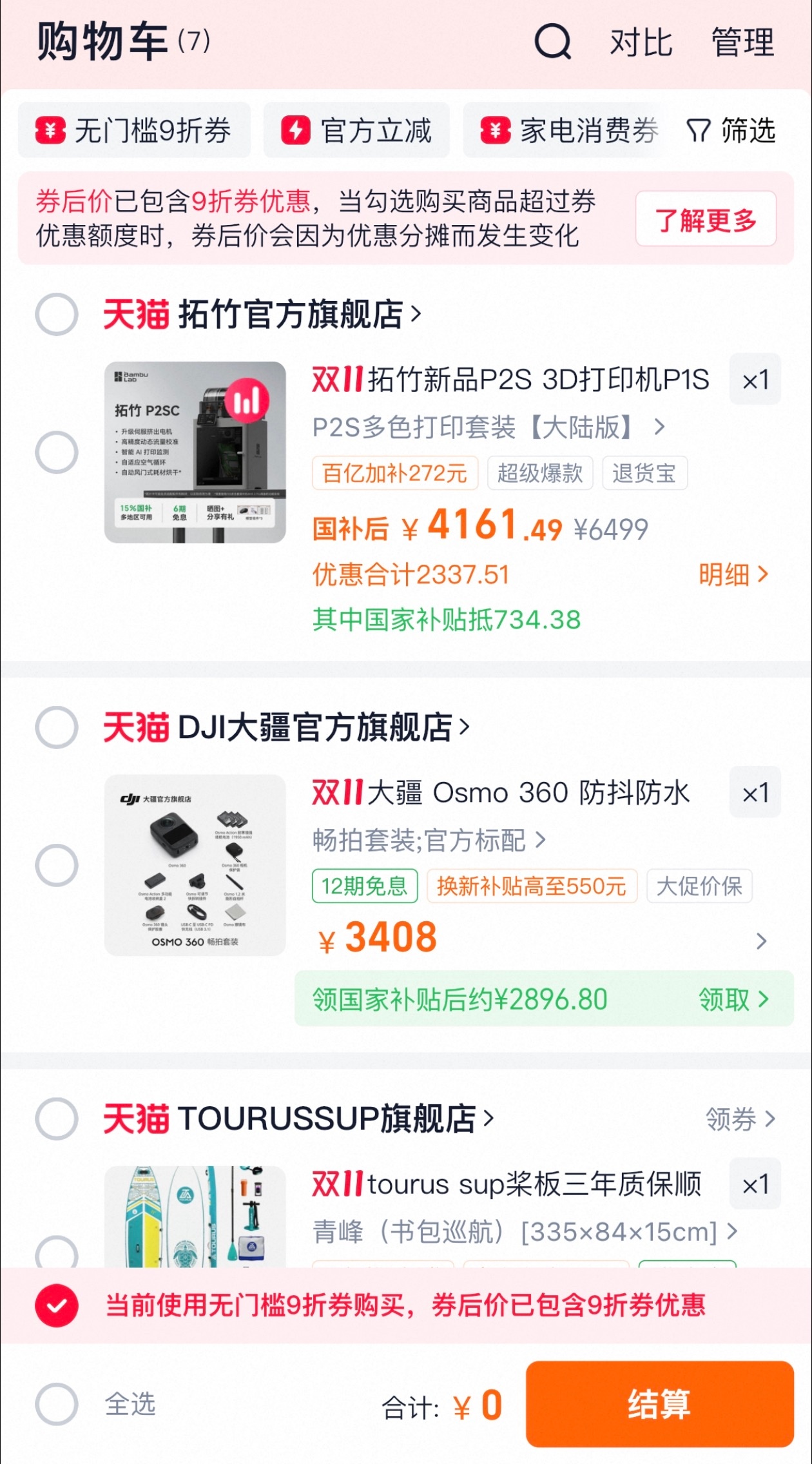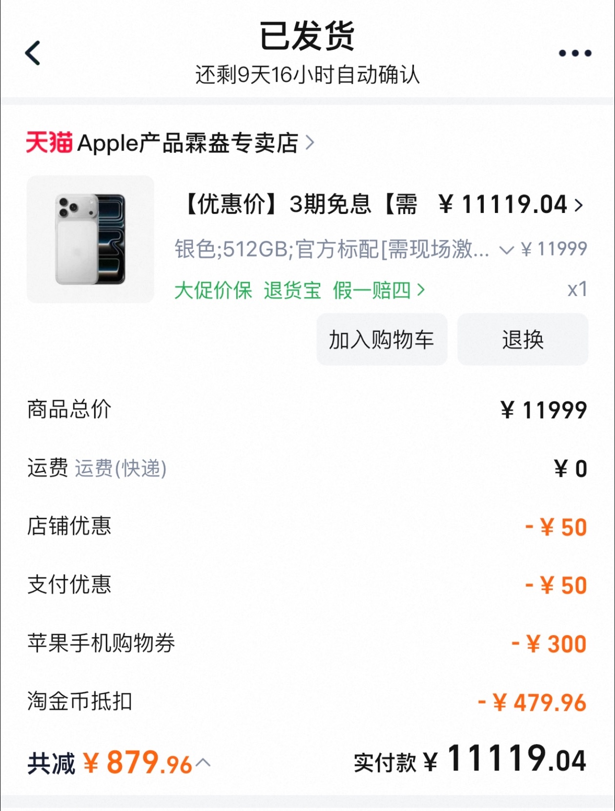 我发现天猫双十一的价格很可以啊,来一起冲刺24小时,今年叠加的折扣够多,88VIP消费券+品类券+国补外,注意还有淘金币呢。像我就又给同事买了一部iPhone17 Pro Max用来拍摄短视频,512GB到手11119.04元,主要是300元苹果手机购物券 + 50元店铺优惠 + 479.96元淘金币抵扣 + 50元支付优惠,在便宜了接近900元的基础上还有3期免息分期,不要太爽,如果有部分银行信用卡的朋友可以享受200元的支付优惠,叠加完优惠超过1000元了,很给力,发货时间特别迅速,24小时发货,第二天就到货。正好趁着双十一的折扣,我给智界R7也买了车顶旅行箱,打造了一辆很有格调的潮改车,但是为了让我改的车更帅,我正在研究3D打印机,这样给工作室打一点小玩意,改装车的时候也可以用的上,再整个DJI Osmo 360开飞机的时候更好录制,多看多学。