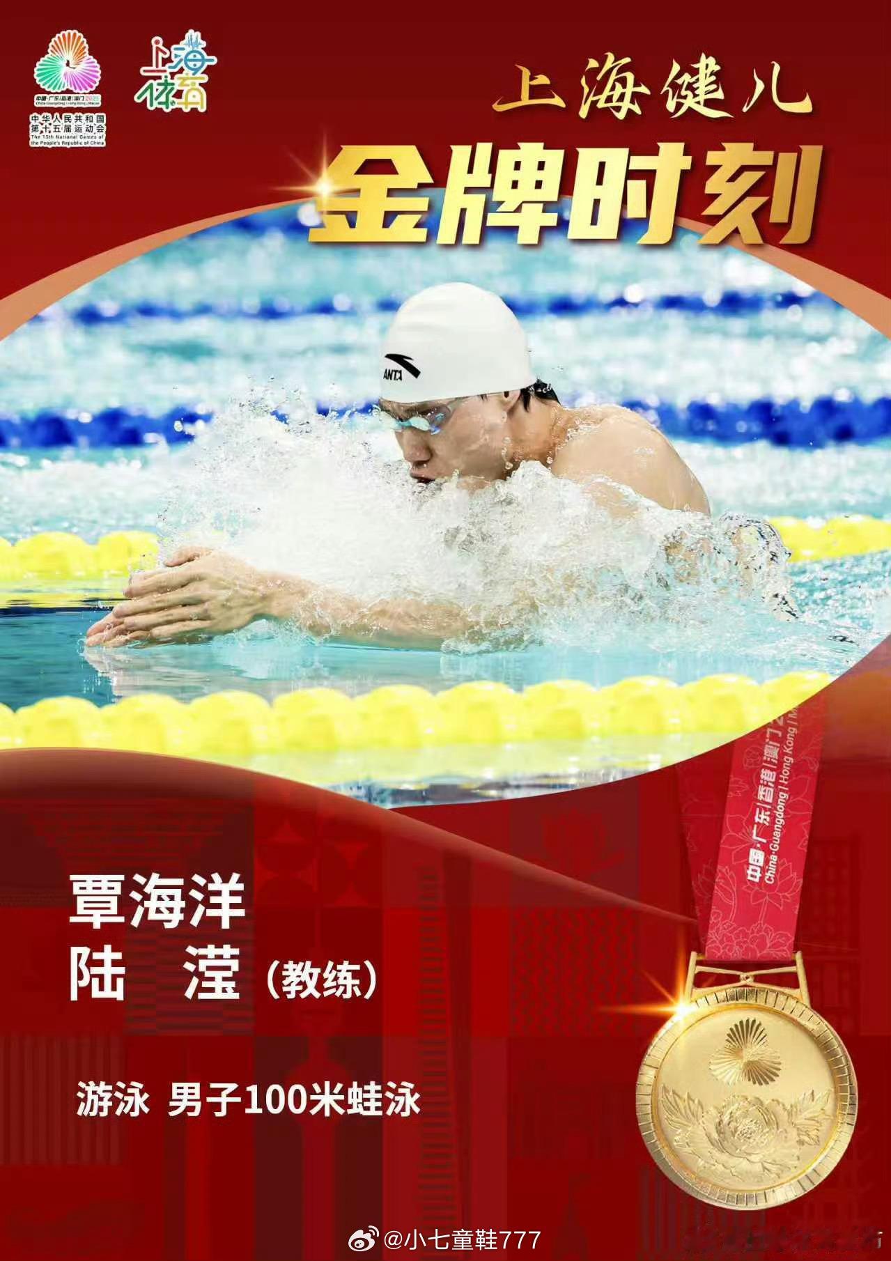 第十五届全运会游泳男子100米蛙泳决赛,上海队选手覃海洋以58秒98获得冠军。另外一名上海队选手郑英昊以59秒47获得银牌,湖北队选手闫子贝以59秒49摘得铜牌。