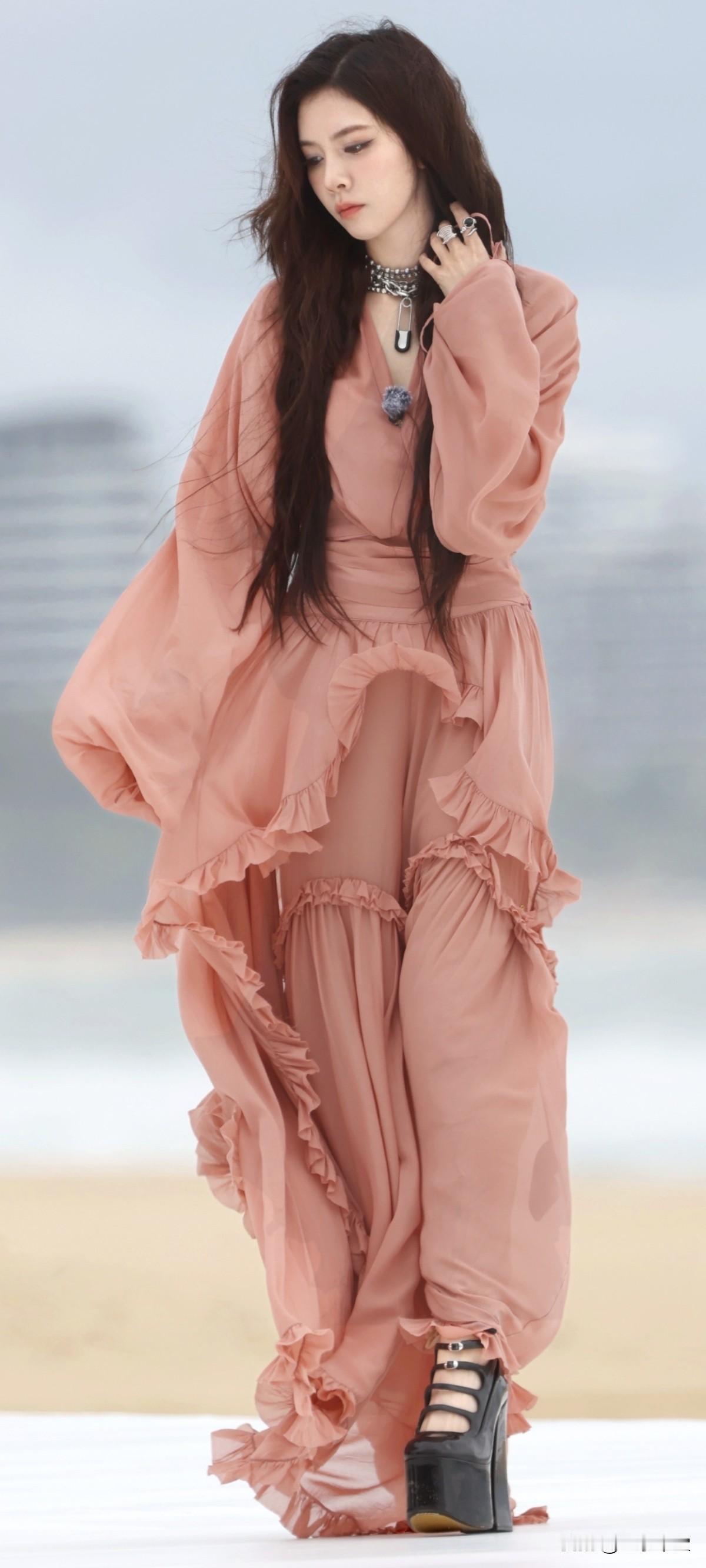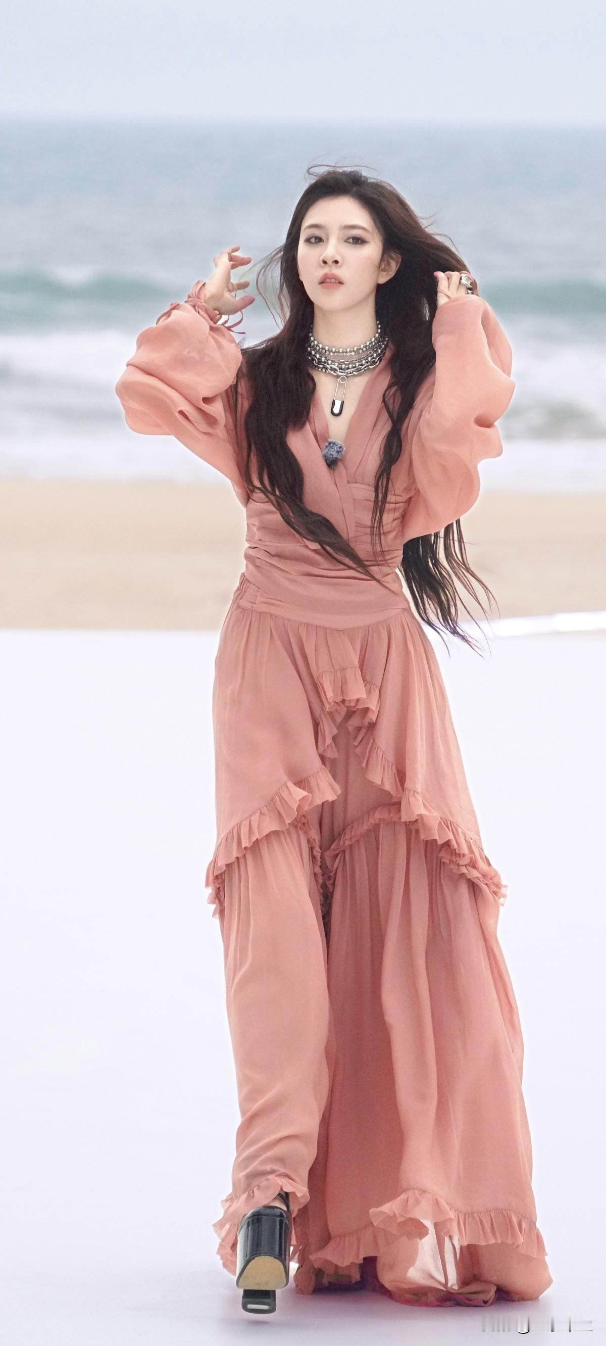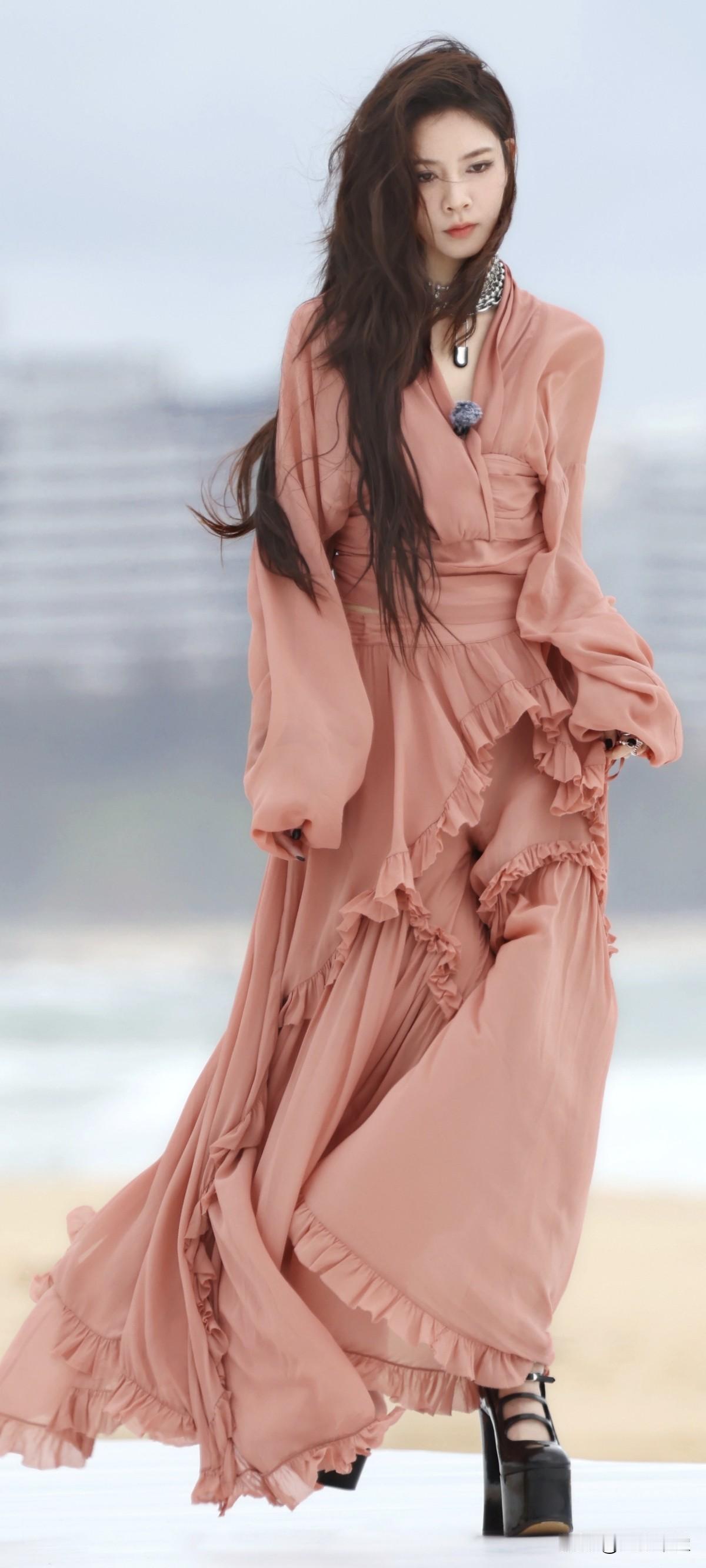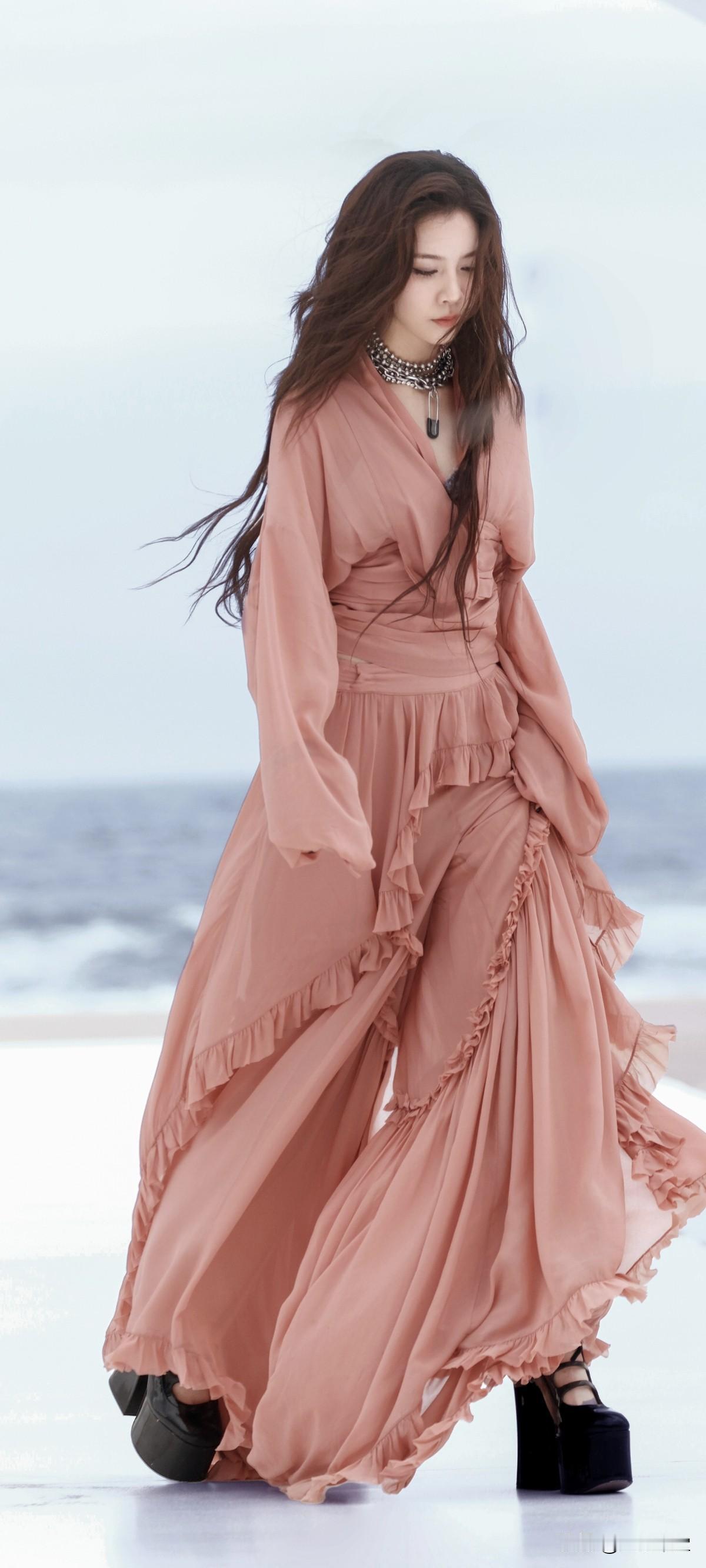 宋妍霏黑色超高跟,这波是海边的粉色仙子吧!美翻了~这高跟鞋也太高了吧!