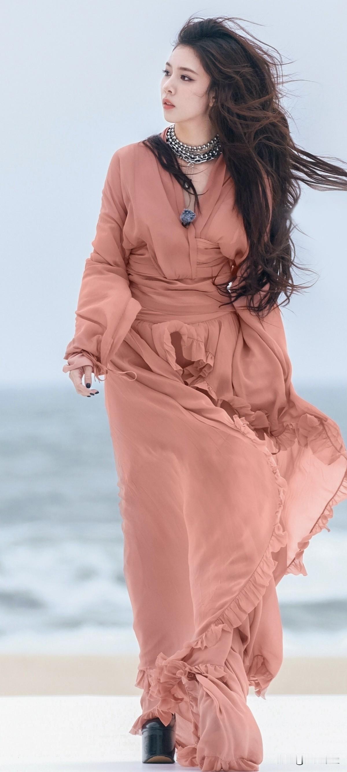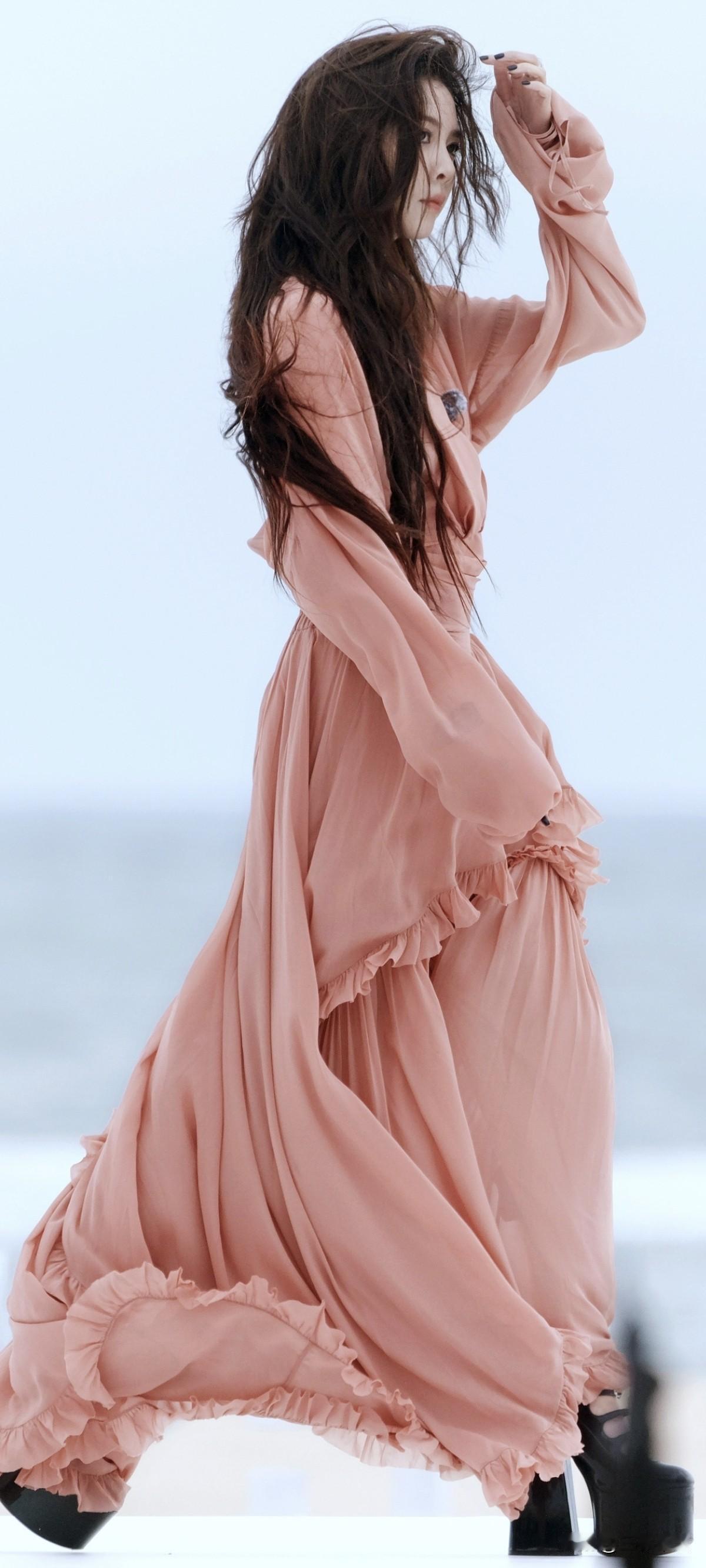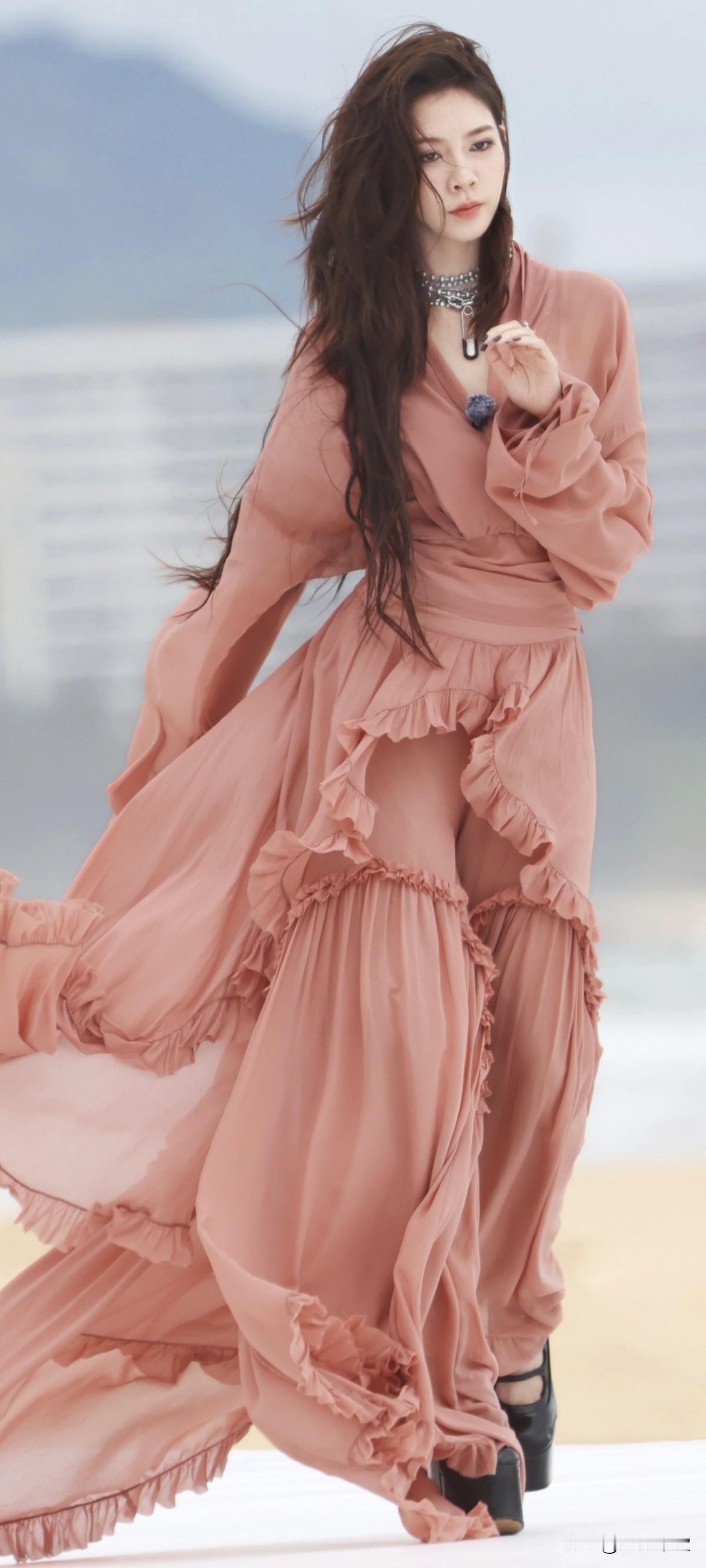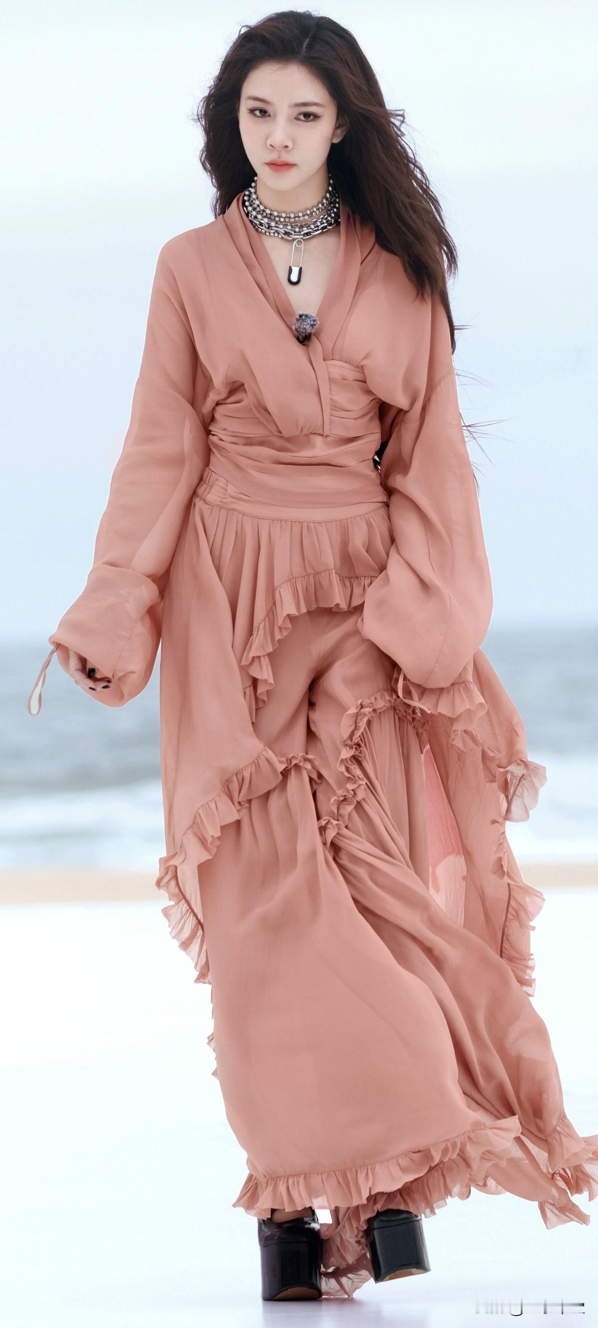 宋妍霏黑色超高跟,这波是海边的粉色仙子吧!美翻了~这高跟鞋也太高了吧!