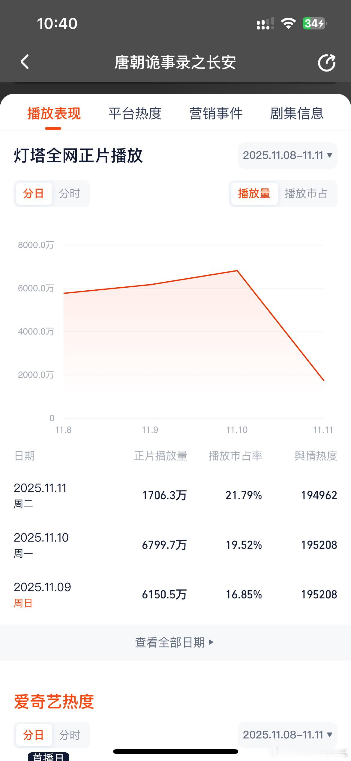 杨旭文、杨志刚周一热度9959,比周日略低,正常规律。 周二中午曲线又交叉了,比周一同时段热度略低,现在已经追上了,交叉点热度维持在9800,顺其自然,晚上更新看看能冲到哪虽然灯塔看鹅桃芒数据不准,但看着诡3周一比周日高550万,两云应该是看涨的,周一能涨就是好事~酷云点播应该能上5000万,云合应该也有4300+~