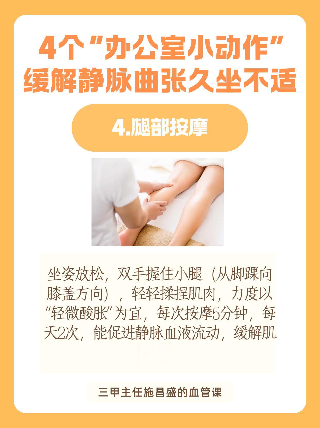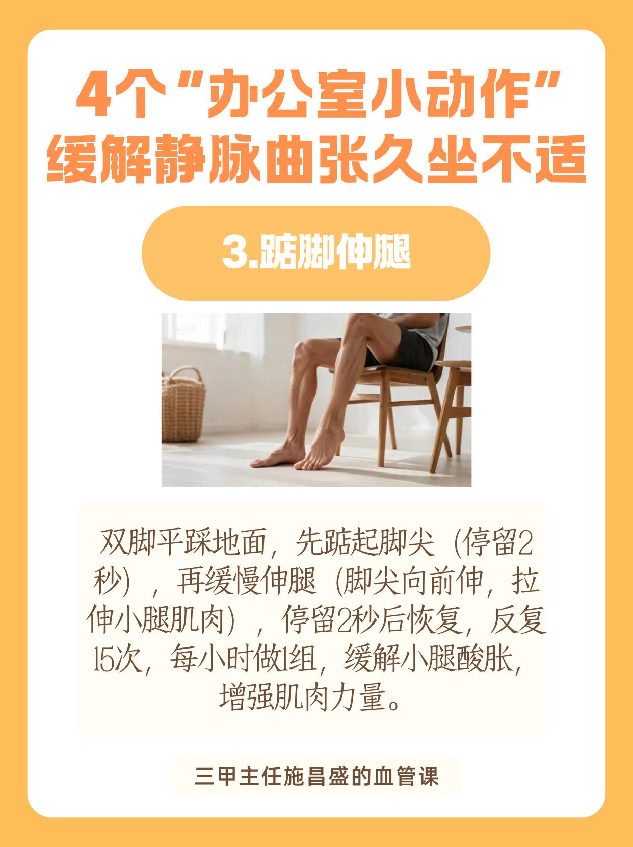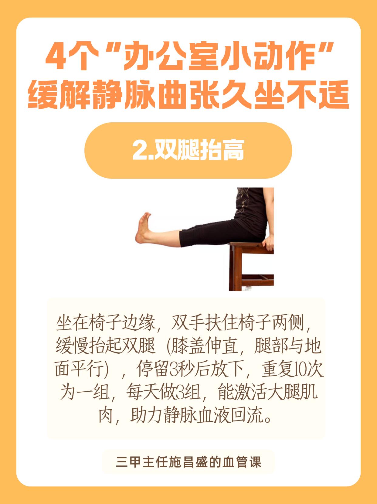 4个“办公室小动作”缓解静脉曲张久坐不适。办公室白领若患静脉曲张,久坐时可做这4个动作,随时缓解腿部酸胀