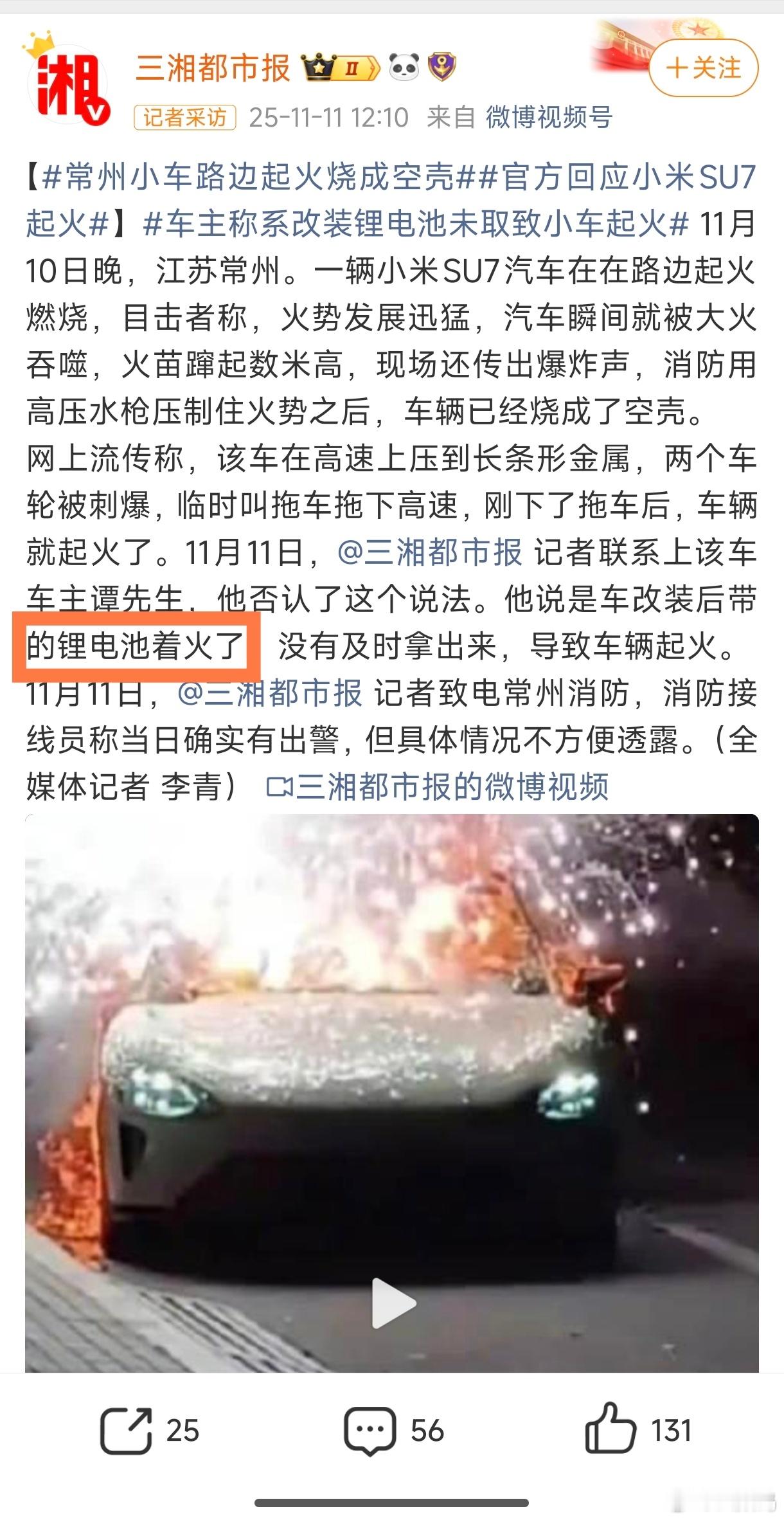 常州这台小米SU7车主回应了,是车改装后带的锂电池着火,没有及时拿出来,导致车辆起火。所以我上午怎么说来着,车子不要乱改什么线路,不要用一些乱七八糟的杂牌的车充、车载产品,特别是带锂电池的。另外,不要放一些酒之类的危险源。车子,越原厂越“干净”越好。