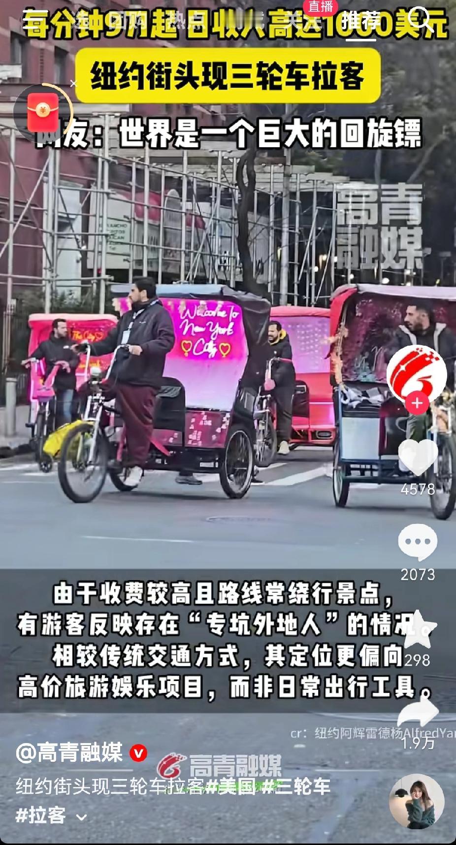济南的风吹到了纽约!这下济南全国第五没人怀疑了吧!这国际影响力大大的。 最近,纽约街头出现了彩车,主要面向游客提供观光服务。 网友:啥,我这是到了济南吗? 经过鉴定,彩车的花样没有济南的多,科技也没济南的高(济南是电动的,纽约人力的),但济南的价格没有纽约的贵,纽约的一分钟9刀,济南的一分钟9块钱。