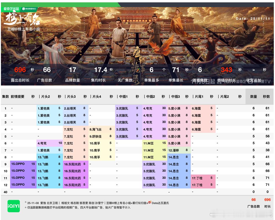 杨旭文、杨志刚 开播第4天❗️破了就接了,恭喜❗️云合大概率就是4000多万了酷云5000+万~🥝太急,有人嘲播放量数据就躺平,剧守住口碑剧粉就满意了。今天招商倒是新高,最新单集加回6广71s了17品牌,总时长696s,