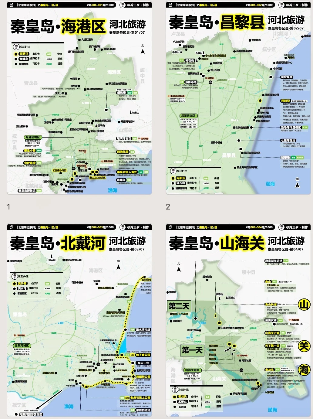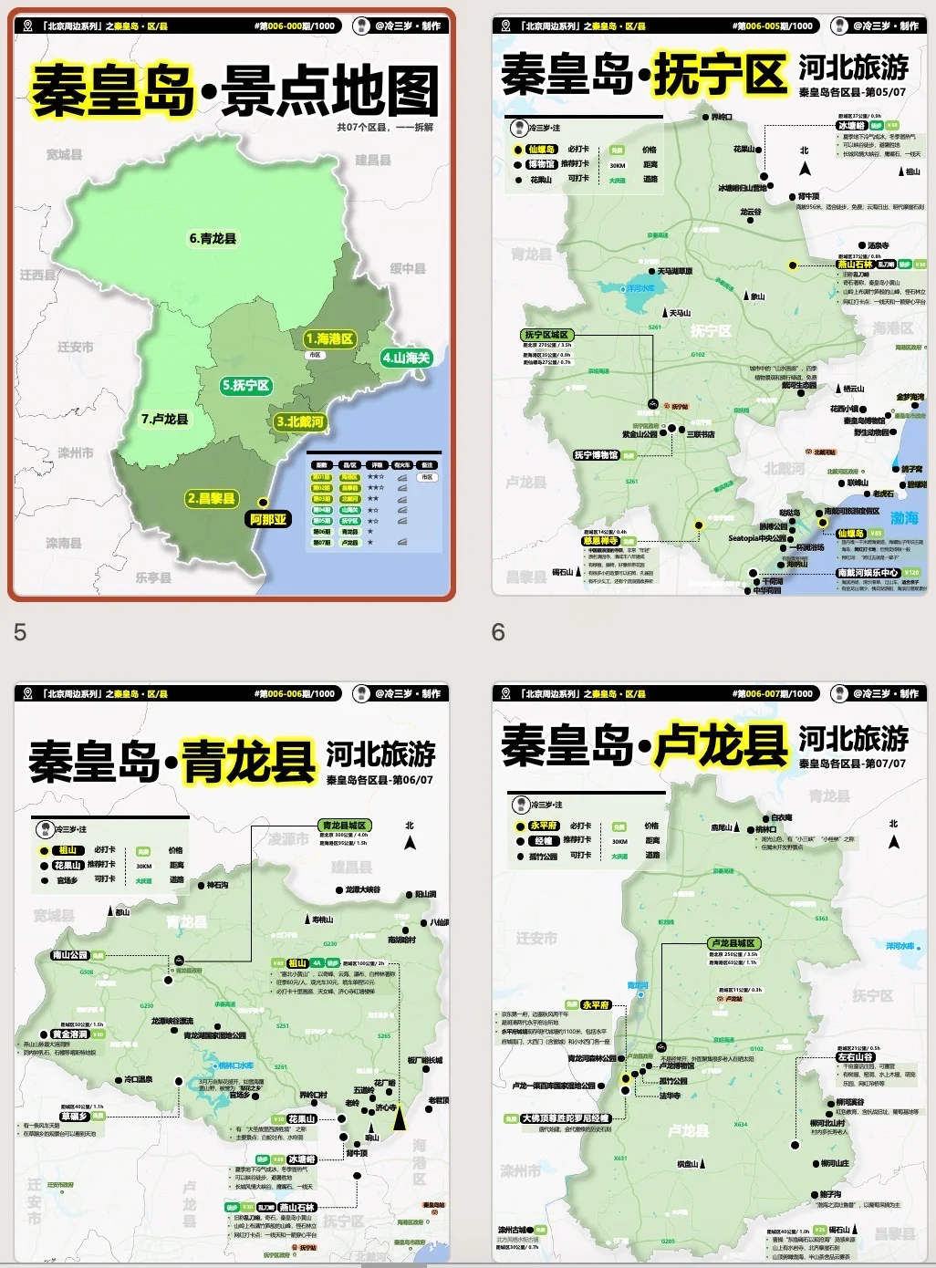 算了算,河北旅游第一梯队的 承德,张家口,保定,秦皇岛,邯郸 [doge][doge]但能进前三的,会是哪几个? 其中承德我会投一票,其他呢? [蹲后续H]你咋看? [doge][doge]此外 ,秦皇岛,能排到前面的是 山海关,海港区,昌黎县,北戴河 [蹲后续H]如果按顺序排?你会怎么选? PS: 图1,是秦皇岛主要景点分布 图2~3,是秦皇岛各区县旅游地图概览 图4,是阿那亚攻略