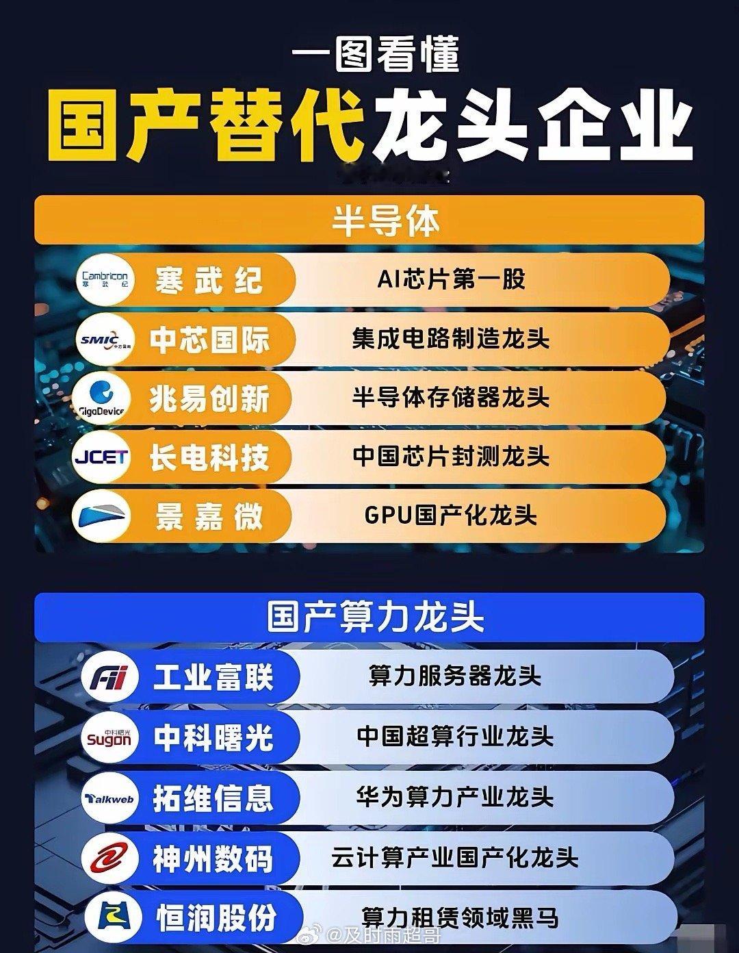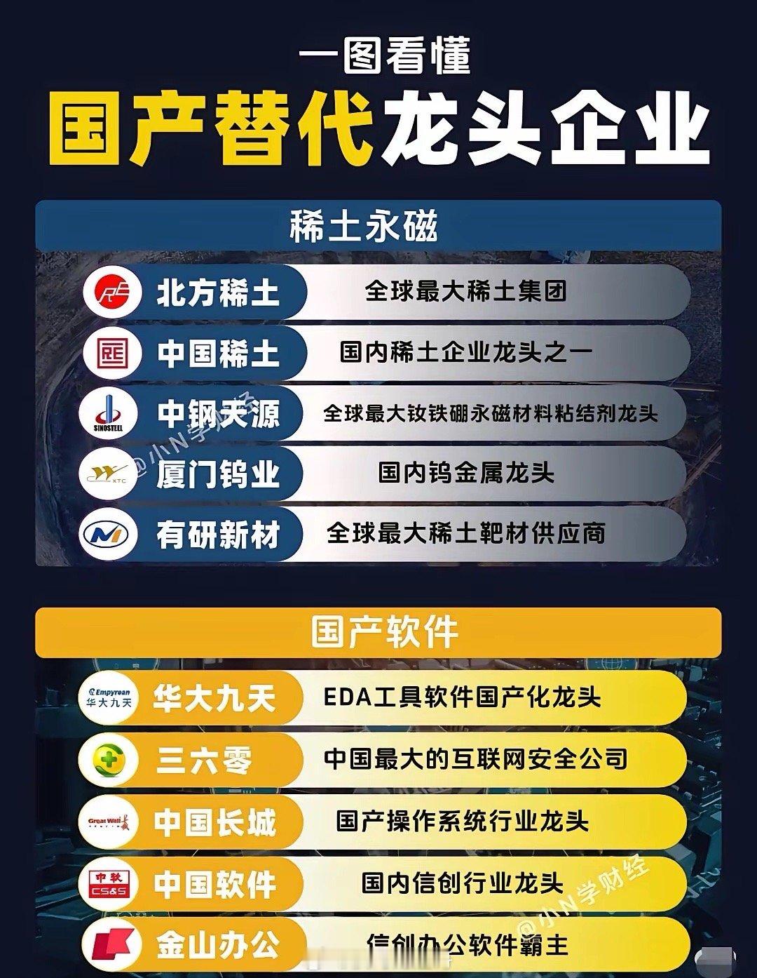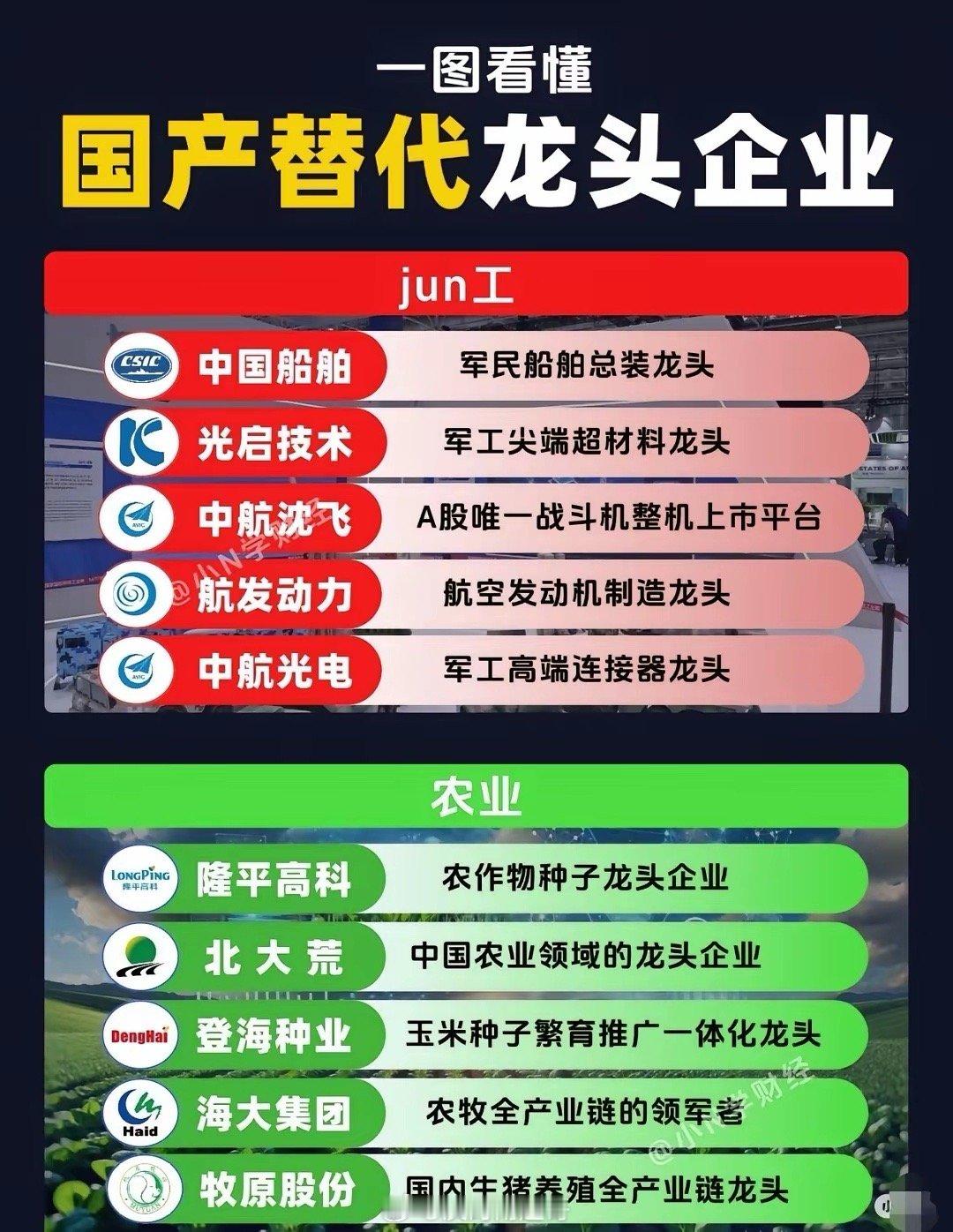 “国产替代龙头企业”,分别从多个关键科技与战略行业,介绍了具有代表性的中国领先企业。第一张图聚焦于半导体与国产算力两大高科技领域。- 半导体板块:列举了寒武纪(AI芯片第一股)、中芯国际(集成电路制造龙头)、兆易创新(半导体存储器龙头)、长电科技(中国芯片封测龙头)、景嘉微(GPU国产化龙头),代表了中国在芯片设计、制造、存储、封装测试及图形处理器等核心环节的领先企业。- 国产算力板块:包括工业富联(算力服务器龙头)、中科曙光(中国超算行业龙头)、拓维信息(华为算力产业龙头)、神州数码(云计算产业国产化龙头)、恒润股份(算力租赁领域黑马),展现了中国在算力基础设施、云计算、超算及算力服务等领域的关键企业布局。第二张图则关注稀土永磁与国产软件两大战略与基础软件领域。- 稀土永磁板块:涵盖北方稀土(全球最大稀土集团)、中国稀土(国内稀土企业龙头之一)、中钢天源(全球最大钕铁硼永磁材料粘结剂龙头)、厦门钨业(国内钨金属龙头)、有研新材(全球最大稀土靶材供应商),凸显中国在全球稀土资源及高端永磁、靶材材料方面的主导地位。- 国产软件板块:包括华大九天(EDA工具软件国产化龙头)、三六零(中国最大的互联网安全公司)、中国长城(国产操作系统行业龙头)、中国软件(国内信创行业龙头)、金山办公(信创办公软件霸主),反映了中国在工业软件、网络安全、操作系统、办公软件及信创生态中的核心力量。第三张图着眼于军工与农业两大国家战略基础行业。- 军工板块:有中国船舶(军民船舶总装龙头)、光启技术(军工尖端超材料龙头)、中航沈飞(A股唯一战斗机整机上市平台)、航发动力(航空发动机制造龙头)、中航光电(军工高端连接器龙头),代表了中国在船舶制造、航空航天、军工材料及关键元器件上的自主能力。- 农业板块:包括隆平高科(农作物种子龙头企业)、北大荒(中国农业领域龙头企业)、登海种业(玉米种子繁育推广一体化龙头)、海大集团(农牧全产业链领军者)、牧原股份(国内生猪养殖全产业链龙头),展示了中国在种业、农业种植、农牧行业及畜牧养殖等关键农业产业链上的重要企业。综上,这组信息图系统梳理了中国在半导体、算力、稀土、软件、军工、农业等多个核心和战略行业的国产替代领军企业,有助于直观了解当前我国推动关键技术自主可控、产业升级的重要力量布局。