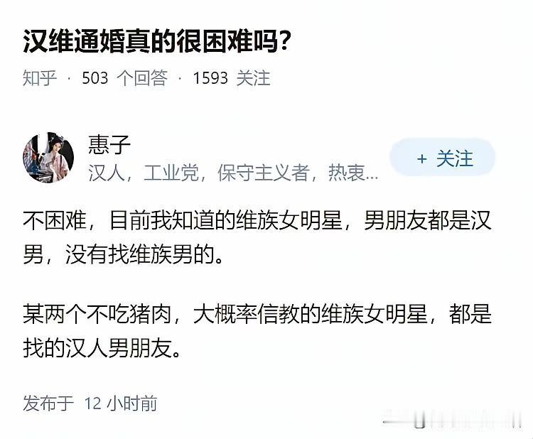 维汉通婚已经几十年了! 再看维吾尔族的女明星,迪丽热巴,热扎依,古力娜扎,玛尔扎哈等人,在娱乐圈和文艺圈,那也是鼎鼎大名。其实这种维族女明星的崛起,对拉近距离很重要的。更多维族小女孩,也会走上女明星之路,别说还有好多维族女网红有大量粉丝了。 维汉通婚很正常,维族也是雄鹰一样的男人,一样非常强大。还记得有个维族脱口秀女演员,说自己的爸爸,结婚离婚很多次,一样可以娶媳妇,就知道维族女孩也是很看得开的。 重点来讲,就是说民族平等下,维汉通婚已经不再是个例,而是很多。这才是民族大融合的时刻。 不管咋说,现在的新疆,乃是一带一路的重要节点,后续新疆持续降水,大量沙漠消失,迎来的是大农场的建立,仅次于东三省的粮食基地。因为新疆足够大,未来极为重要。