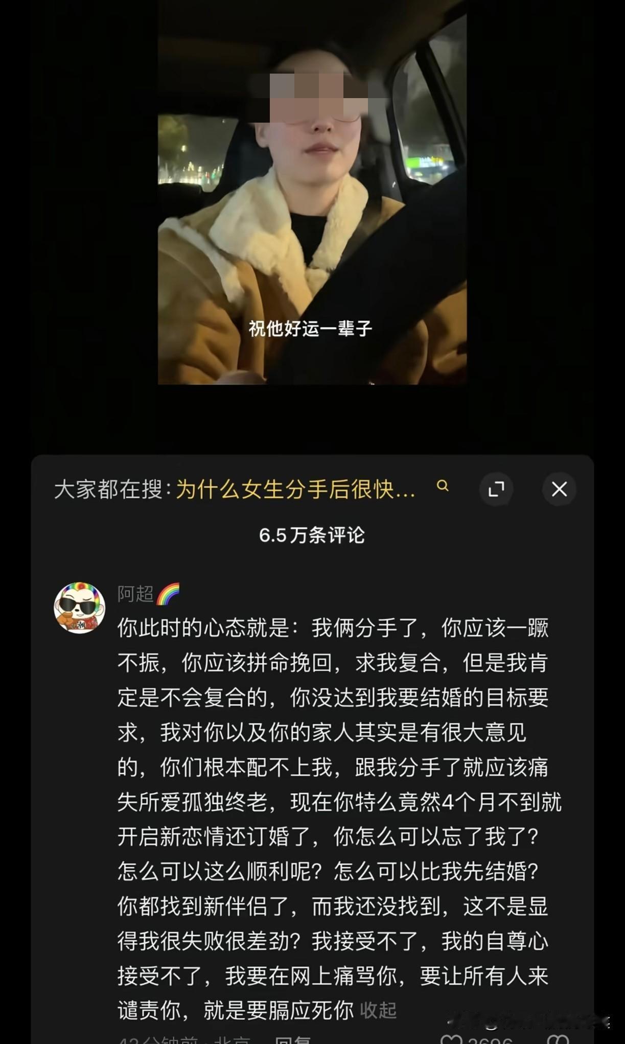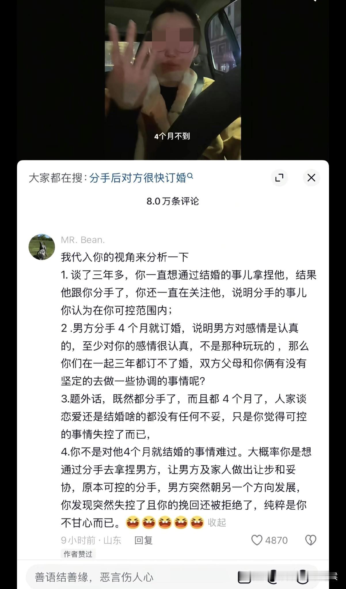 真是搞笑[笑哭]。刷到一视频,女生在视频里哭诉前男友的无情无义,说俩人谈了三年,今年六月份分手,结果九月份前男友就订婚,十月份直接结婚了。 据说俩人恋爱期间所有开销都是男方承担的。期间女生跑去考公务员,都还没考,心态就变了,觉得男方家庭条件差,配不上自己,然后提出了分手。 既然是自己选择分手,那就好聚好散。分手四个月,人家谈恋爱、订婚、结婚没有任何问题,闪婚的案例多的是。可能女生是以为男生会来求自己复合,挽留自己,然后发现对方根本没按自己的剧本走,瞬间就破防了[泪奔]。恋爱 分手