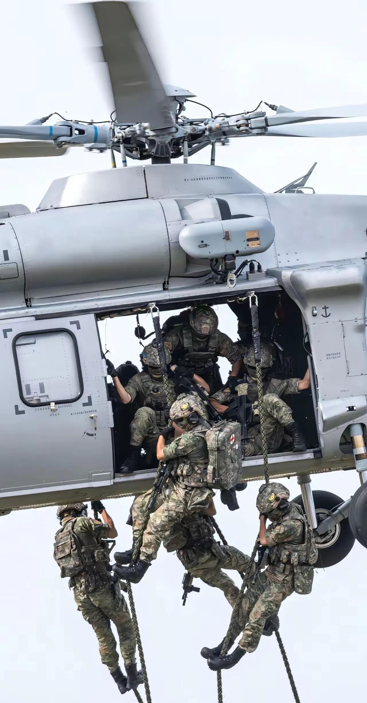 直20F悬停突降,迷彩精神小伙,一跃而出,肩膀挂着191,杀气腾腾,鹰酱范太正了! 不过,好像战术包有点小了吧,放眼望去,也就卫生员的包大点,如果是表演,那情有可原。 讲真的,这种速降,不系安全绳,确实危险,对于站在梯子上就恐高的人来说,腿都软了,还去扒绳,想都别想。 所以,保险起见,一般让卫生员先下![捂脸]