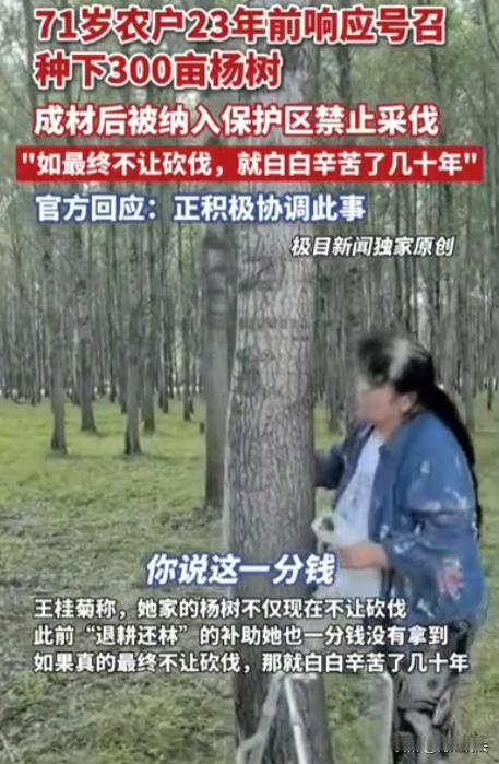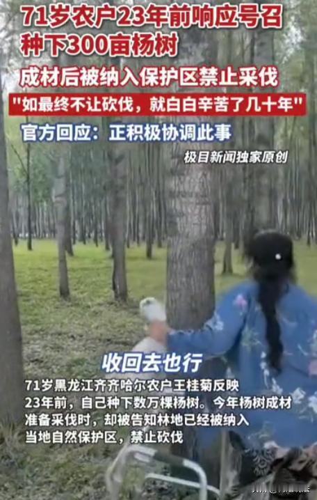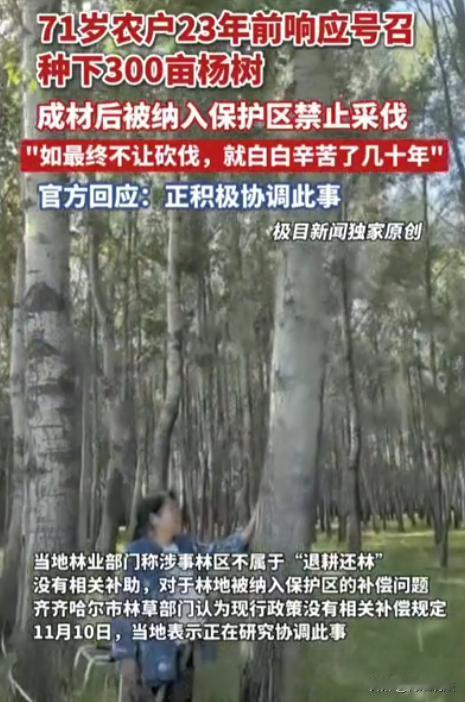 黑龙江齐齐哈尔,71岁的农户王桂菊,在23年前种下数万棵杨树,如今杨树成材准备采伐,却被告知林地被纳入自然保护区,禁止砍伐。不仅如此,此前退耕还林的补助她一分都没拿到,23年的投入,财力物力花了不少,若真不能砍伐,几十年的辛苦就白费了,这让她和家人十分发愁。 王桂菊老人今年71岁,23年前,在富海镇政府和大队领导动员下,她与富民村村委会签了《造林承包合同》,在360亩承包地上种杨树。 第一年树苗是政府给的,第二年她又自己买苗补种,此后二十多年精心护林。 如今树长大了,到采伐期,女儿张丽准备办采伐证时,却发现林地被纳入黑龙江乌裕尔河国 家级自然保护区,采伐申请被拒。 而且23年里,退耕还林的补助,一分也没拿到。 母亲这么大岁数,辛辛苦苦种了23年树,现在树不能砍,这日子可咋整?她多次反映情况,可得到的答复总是让她很无奈。 母亲造林的时候那块地可不是保护区,现在变成保护区不让砍树,总得给点补偿吧,却被回应说没有这样的补偿规定。 相关部门说,王桂菊老人种的这片地,现在不属于退耕还林范围,所以没有补贴政策。 张丽拿出合同,指着上面退耕还草(林)的字样,说这明明就是退耕还林,咋就不算数了呢? 可相关部门说,那是三北工程造林地,和退耕还林不是一回事,而且王桂菊老人没签退耕还林合同,名单里也没她俩名字。 张丽要求相关部门公开信息,看看这退耕还林到底咋回事,可相关部门就是不给,说这是内部规定,不能随便公开。 张丽没办法,只能继续找,找镇里,找县里,找市里,可就是没人能给她个准信。 镇里倒是提了个林权互换的办法,说可以把这片林地的使用权和其他地方的林地使用权换一换,这样王桂菊老人就能在其他地方砍树了。 张丽一打听,这林权互换哪是那么容易的事,涉及到的手续、费用、时间,都不是他们能承受的。 现在,这片林地的承包合同也快到期了,可事情还是一点进展都没有。 张丽看着母亲每天为这事发愁,心里也难受,为什么母亲种的树,现在就不能砍了呢?为啥别人都能拿到退耕还林补助,他们就不能呢? 在张丽看来,母亲签订了合同,投入了大量的时间、精力和钱,现在因为政策变化导致无法采伐,还没有补贴,这显然是不合理的,她希望能尽快给出一个解决方案。 在张丽和母亲看来,政策也应该考虑到实际情况,不能让像她们这样的普通农户吃亏。 以法律分析看,王桂菊老人和村委会签的造林承包合同,那是受法律保护的。 王桂菊和富民村村委会签订了《造林承包合同》,这是双方真实意思表示,合同合法有效。 根据《民法典》第四百六十五条规定:“依法成立的合同,受法律保护。依法成立的合同,仅对当事人具有法律约束力,但是法律另有规定的除外。” 王桂菊按合同约定在承包地上种树,履行了合同义务。 合同里明确写了,王桂菊老人有权在承包地上种树,也有权在树成材后进行采伐。 合同到期,按常理她有权对树木进行处置,但因林地被纳入保护区无法采伐,这就产生了合同履行障碍。 现在,林地被纳入自然保护区,这属于政策变化,但政策变化不能成为剥夺王桂菊老人合法权益的理由。 王桂菊老人到底能不能拿到补偿呢? 根据《森林法》规定,国家建立森林生态效益补偿制度,对公益林进行补偿。 王桂菊老人的林地被纳入自然保护区,这公益林的性质就明确了。 虽然相关部门说没有补偿规定,但这和森林法是不符的,王桂菊老人有权要求相关部门按照公益林的标准进行补偿。 《退耕还林条例》规定,国家对退耕还林者给予现金、实物等补助。 王桂菊老人的合同里写了退耕还草(林),虽然相关部门说这是三北工程造林地,但三北工程也是国家为了改善生态环境而实施的,和退耕还林的目的是一致的。 根据《森林法》第五十六条:“采伐林地上的林木应当申请采伐许可证,并按照采伐许可证的规定进行采伐。” 而且,王桂菊老人没签退耕还林合同,名单里也没她俩名字,这不能成为不给她补助的理由。 《森林法》第五十五条第三项明确规定:“自然保护区的林木,禁止采伐。” 本案中,林地被纳入国 家级自然保护区后,采伐行为因涉及生态保护被行政许可禁止。这导致合同约定的采伐权因政策变化无法实现,构成法律上的“履行不能”。 应该查清楚,当年退耕还林的范围,到底包括不包括王桂菊老人的这片地,如果包括,那就得给她补助。 从法律角度看,王桂菊老人是有胜诉的可能的。 她有权要求相关部门按照公益林的标准进行补偿,这是森林法规定的。 她的林地确实属于退耕还林范围,那她也有权要求相关部门给予补助,这是退耕还林条例规定的。 如果王桂菊老人起诉,被告方需要拿出证据来证明他们的行为是合法的,否则就得承担法律责任。 目前,这事儿还在协调中,各级部门都在想办法解决。不管怎么说,王桂菊老人的合法权益是不能被侵犯的。