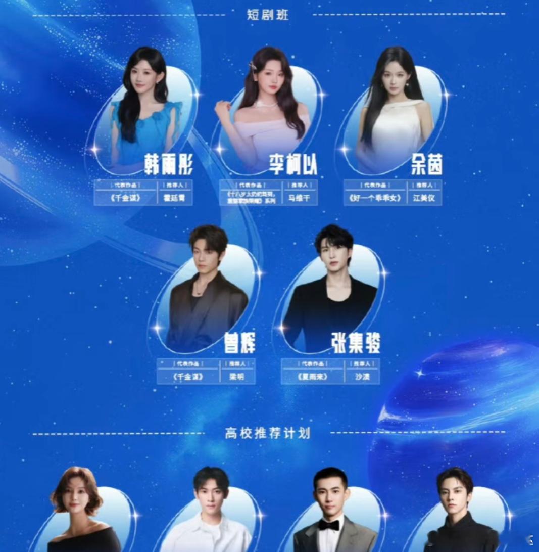 【2025电影频道“星辰大海”青年演员优选计划入选名单】(按姓氏拼音首字母排序)陈少熙 代表作:《倒仓》 推荐人:曹保平陈雨锶 代表作:《误杀2》 推荐人:戴墨丁真珍珠 代表作:《永不失联的爱》 推荐人:宁静樊治欣 代表作:《对我而言危险的他》 推荐人:陈祉希鹤男 代表作:《入青云》 推荐人:张冀贺雨禾 代表作:《去看大海》 推荐人:舒淇黄毅 代表作:《有朵云像你》 推荐人:陈思诚江信熹(中国澳门) 代表作:《我的二分之一男友》 推荐人:杜华林秋楠 代表作:《捕风追影》 推荐人:谢霆锋刘家祎 代表作:《小欢喜》 推荐人:章子怡刘怡潼 代表作:《老狗》 推荐人:杨文军罗秋韵 代表作:《华山论剑之东邪西毒》 推荐人:周一围罗一舟 代表作:《后浪》 推荐人:郑保瑞牟睿妮 代表作:《焕羽》 推荐人:黄晓明穆祉丞 代表作:《初次尝到寂寞》 推荐人:顾游欧阳娣娣(中国台湾) 代表作:《当家主母》 推荐人:蒋勤勤石云鹏 代表作:《小巷人家》 推荐人:郭晓东王玉雯 代表作:《值得爱》 推荐人:贾玲吴希泽 代表作:《一闪一闪亮星星》 推荐人:赵德胤武亚凡 代表作:《封神第一部:朝歌风云》 推荐人:乌尔善向涵之 代表作:《仙台有树》 推荐人:张挺徐卓儿 代表作:《戏台》 推荐人:陈佩斯颜安 代表作:《九重紫》 推荐人:曹盾杨舒伊 代表作:《抓特务》 推荐人:胡歌杨雨潼 代表作:《暗河传》 推荐人:刘敏涛张镐濂(中国香港) 代表作:《相思令》 推荐人:蔡少芬张昕懿 代表作:《那些回不去的年少时光》 推荐人:韩琰张雅钦 代表作:《国色芳华》 推荐人:周冬雨钟丽丽 代表作:《小欢喜》 推荐人:饶雪漫钟雅婷(中国香港) 代表作:《许我耀眼》 推荐人:杨受成卓依娜姆 代表作:《天宝》 推荐人:刘劲短剧班:韩雨彤 代表作:《千金谋》 推荐人:霍廷霄李柯以 代表作:《十八岁太奶奶驾到,重整家族荣耀》系列 推荐人:马维干余茵 代表作:《好一个乖乖女》 推荐人:江美仪曾辉 代表作:《千金谋》 推荐人:梁明张集骏 代表作:《夏雨来》 推荐人:沙漠高校推荐计划:赖子旋 代表作:《秋之梦》 推荐院校:上海戏剧学院徐晟津 代表作:《遇人不熟》 推荐院校:北京电影学院叶禾 代表作:《志愿军:雄兵出击》 推荐院校:中国传媒大学左林杰 代表作:《樱桃琥珀》 推荐院校:中央戏剧学院
