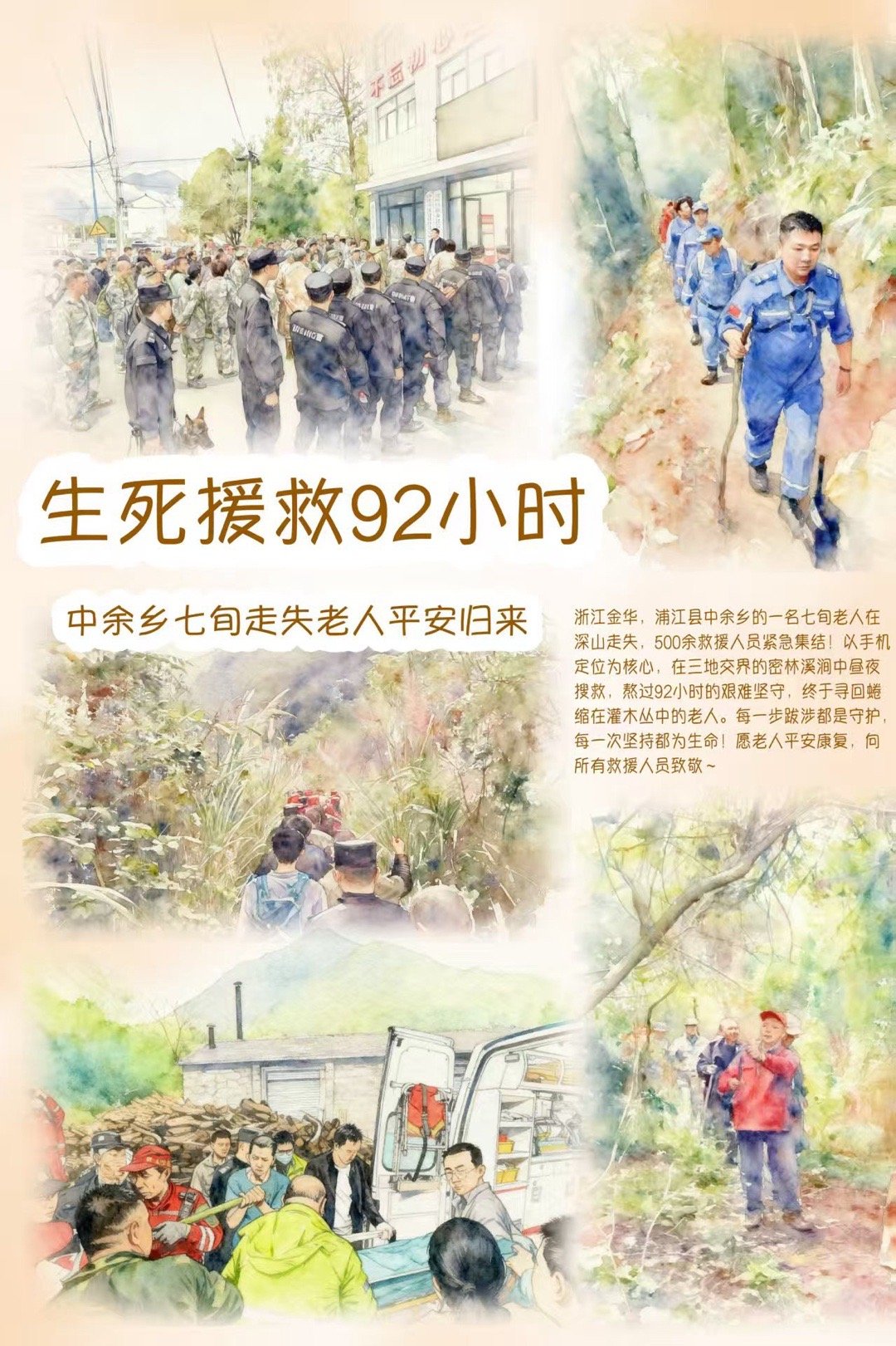 劈开荆棘,踏过泥泞,500余人用脚步丈量三地交界处的深山林海。92小时风雨无阻的坚守,24小时不间断排查,终于在山河村溪涧旁找到蜷缩草丛的老人。这场跨域救援见证了浙里守望相助的力量,更闪耀着生命至上的光芒。(来源:金华公安、浦江县中余乡)