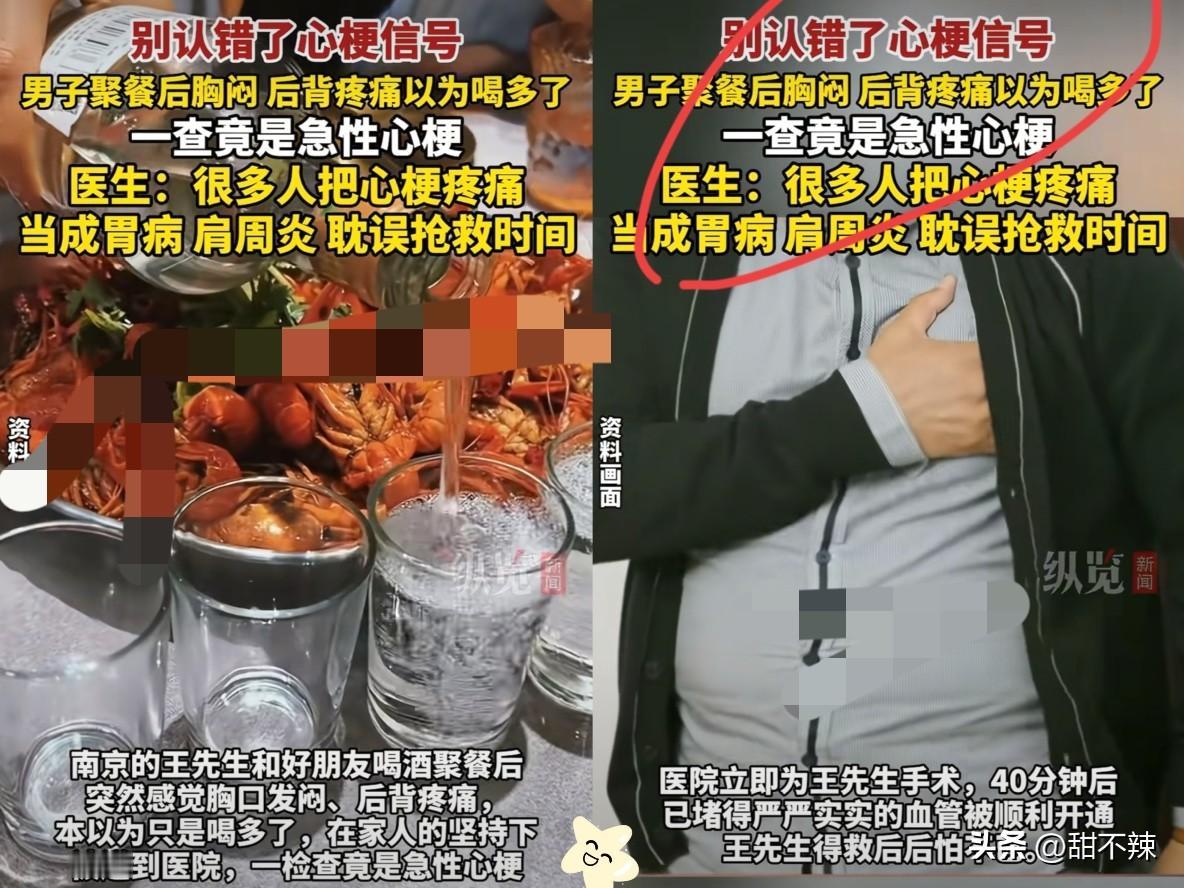 “捡回一条命!”江苏南京一男子和朋友吃饭,喝了点酒后感觉胸闷背疼,他没当回事,结果到医院一查,竟然是 急性心梗! 和老友久别重逢小酌几杯,王先生突然胸闷得喘不上气,后背疼得直冒冷汗,还傻乎乎以为是酒喝急了,想硬扛着不扫大家的兴! 幸亏家人眼尖,看他脸色煞白、腰都直不起来,二话不说拽着就往医院冲! 一检查直接吓懵,心脏主血管堵得严严实实,急性心梗!再晚一步就没救了! 医院立刻开通绿色通道,40分钟紧急手术才打通血管,把他从鬼门关拽了回来! 很多人不知道,心梗根本不只是胸口疼,后背、肩膀甚至牙床疼都可能是信号,特别会“伪装”! 心梗抢救的“黄金120分钟”真不是说着玩的,多耽误一分钟,心肌细胞就多一分不可逆的坏死! 别总觉得“身体棒能扛”,不良习惯攒下的隐患,可能在聚餐、激动时突然爆发!