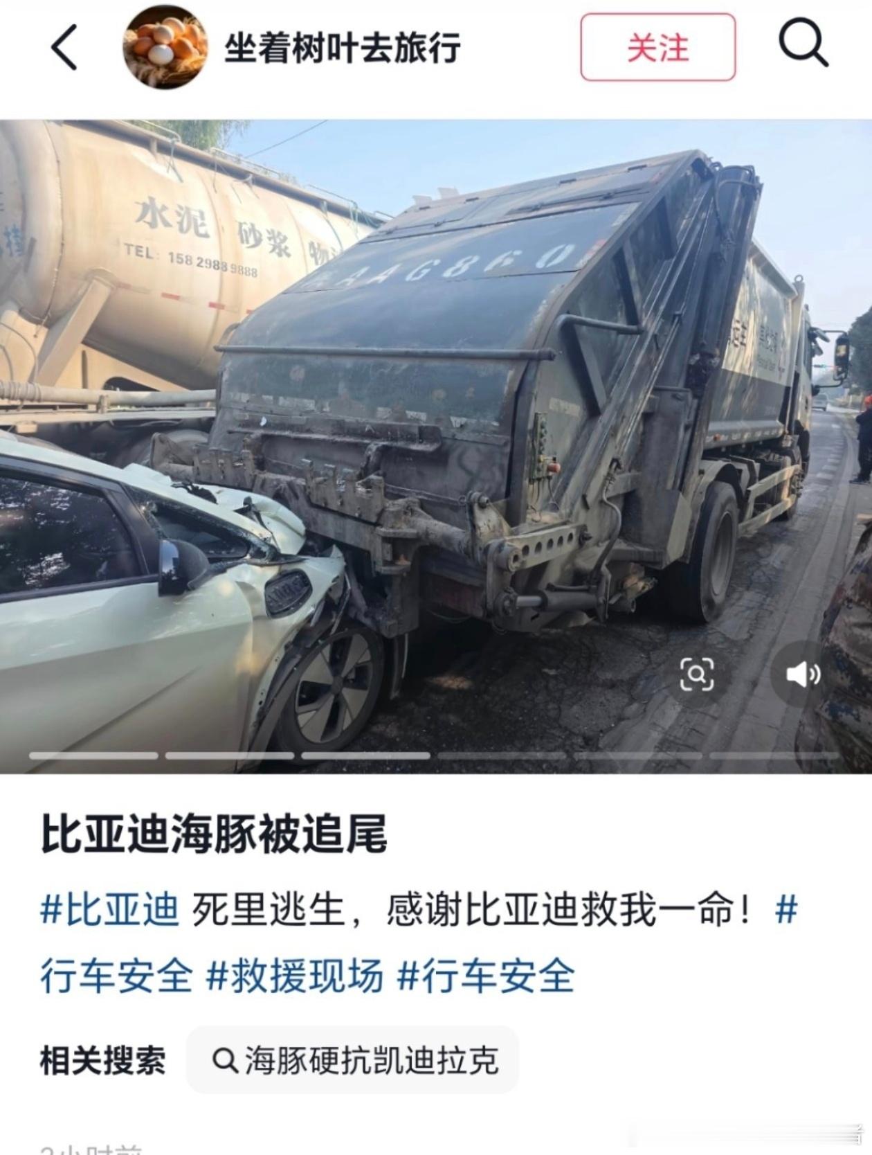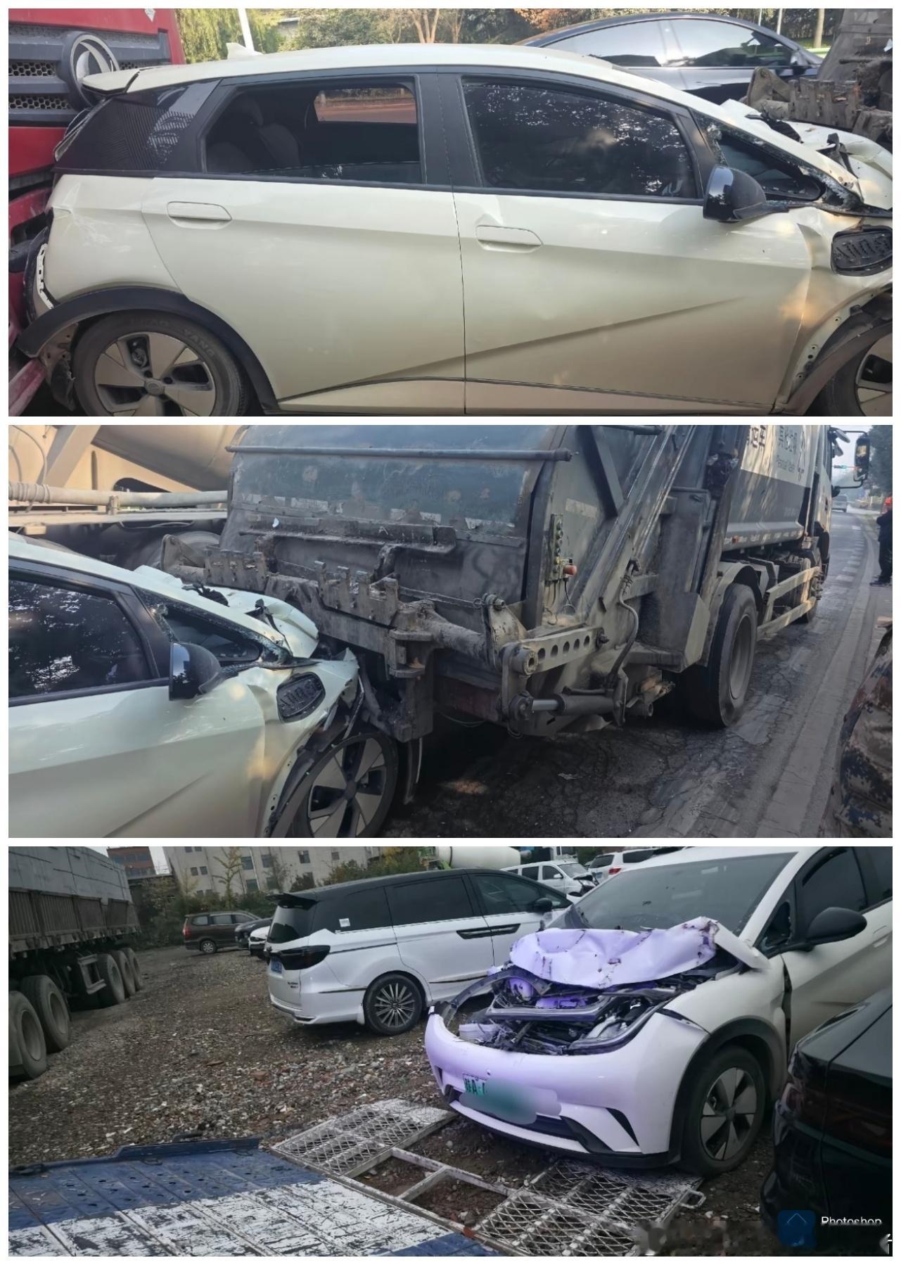 买车还是得看安全性啊,在安全面前其它都是浮云。一辆比亚迪海豚遭遇大货车追尾撞击,造成前后夹击的局面,但人员安全,车辆受损情况也不算特别严重。车门正常打开,车窗正常下降,这安全性非常优秀。还有一辆比亚迪秦Plus遭遇大货车撞击,同样驾驶员安然无恙,车辆安全气囊都打开了。这一刻,直接就值了。