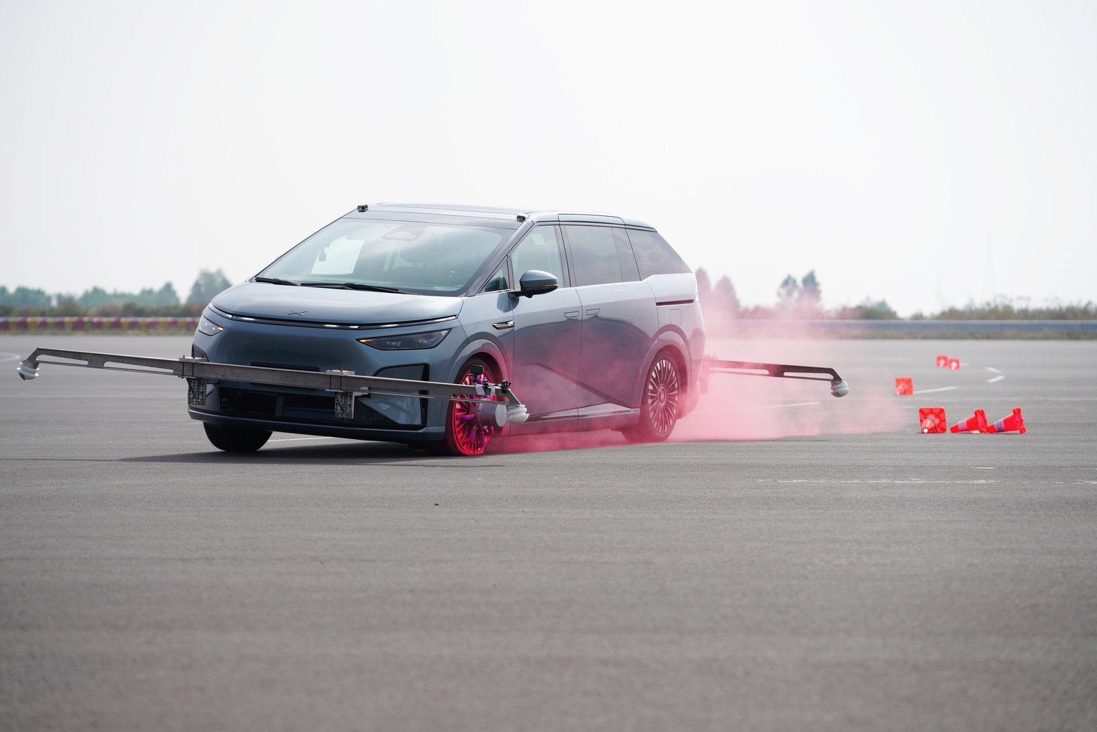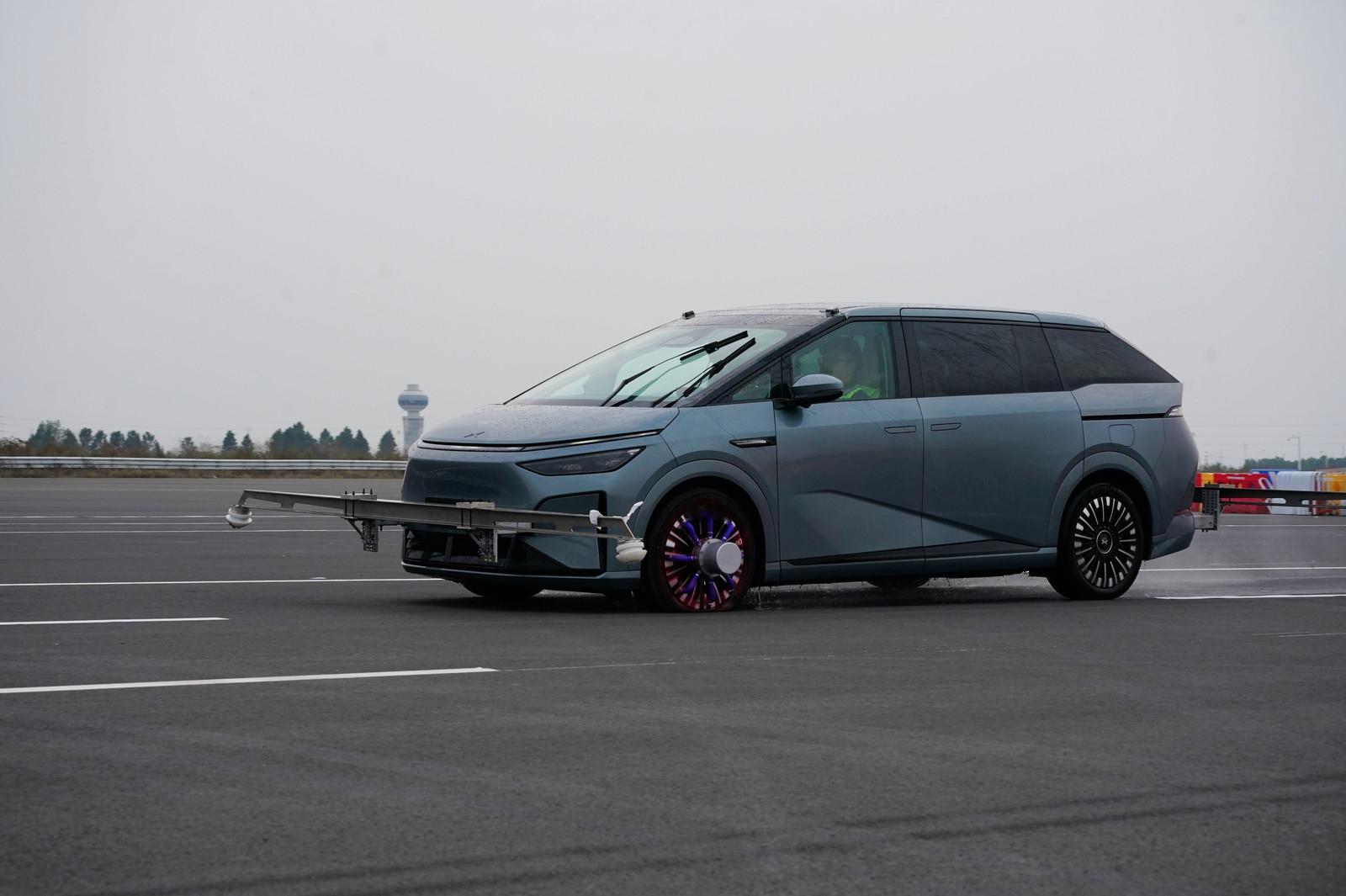 虽然动态还没解禁,但是有些朋友已经关注到了,小鹏X9超级增程是后驱的。一台车长接近5米3、最大功率210kW的后驱MPV,一方面可能会让喜欢驾驶的人浑身燥热,另一方面也可能让追求安稳的用户有所担忧。它的底盘会不会不稳定?它会不会很容易甩尾?当然不会!这次爆胎测试,就是一次很好的证明。和我之前参加过的其他爆胎测试相比,小鹏X9这次测试有3点不同:1. 测试车配重500kg,模拟满载7人!2. 场景特别多,一共进行了6个极端场景的测试:① 60km/h雨天下山急弯单前轮爆胎;② 160km/h雨天积水路面单前轮爆胎;③ 150km/h暴雨天气单前轮爆胎;④ 150km/h同侧双轮爆胎;⑤ 120km/h模拟冰面-沥青对开路面单前轮爆胎;⑥ 90km/h高速绕圆单前轮爆胎;3. 签了免责声明之后,我们可以上车亲自测试!!!刚开始,大家还有点紧张……虽然在场的基本都是资深媒体人,但是做高速爆胎测试,大家都是大姑娘上轿——头一回。上车时不自觉的心跳加速、呼吸急促……结果爆胎控制器一按,啥刺激的感觉都没有。只能感觉到车身一侧塌下去了,然后传来干瘪的轮胎摩擦地面的噪音。做完测试,心理竟然还有些失落事实证明,即使在爆胎的极限工况下,小鹏X9超级增程的底盘也是足够稳定的。在海南试驾时,我们还做了防滑脱困的测试。动态视频解禁的时候大家就会看到,为了打消用户的担忧,小鹏的动力工程师、底盘工程师在超级增程上做出了多少努力。而对于爆胎稳定控制,小鹏X9的技术核心在于两个方面:1. 轮端动态智能识别,200ms就可以识别到爆胎。2. X-VMC全域融合运动控制系统,它可以打通驱动、制动、转向、悬架和人机交互系统,协同控制,保持车身稳定,将伤害降到最低。具体来说,识别到爆胎之后,系统会:▷ 轻微减速;▷ 保持转向平稳;▷ 加大转向手力,避免驾驶员乱打方向;▷ 后轮转向协助修正方向;▷ 增加爆胎侧避振器阻尼;▷ 打开双闪;▷ 发出警报声和仪表大屏提醒。整个过程,驾驶员只需要握紧方向盘,按需缓慢减速,速度降下来再慢慢靠边就可以了。因为不会有任何刺激的情况发生,所以操作也不会有什么门槛,切记不要急刹车就行。中国车企这几年在安全方面,特别是主动安全方面,进步的幅度是巨大的,取得的成绩是有目共睹的。如果说“安全才是最大的豪华”,那么现在像小鹏X9这样的智能新能源车,其实比很多超豪华车还要更加豪华