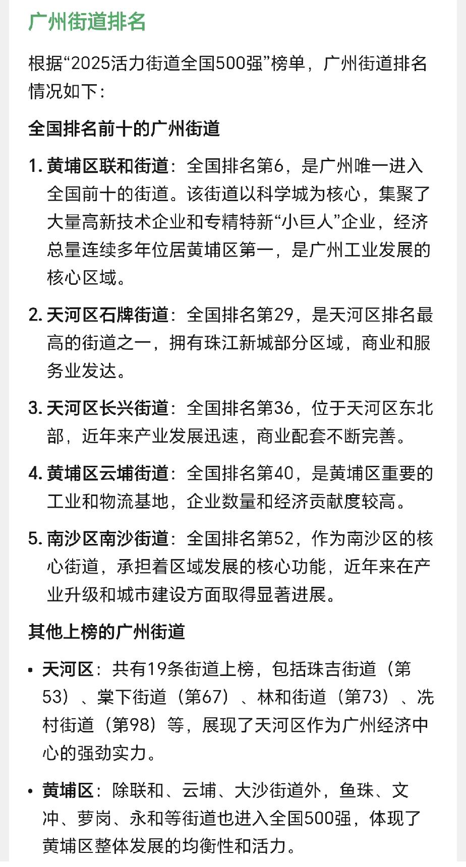 赛迪“2025活力街道500强”名单分享,深圳南山粤海街道稳居第一名,佛山南海桂城街道第四名,黄埔区联和街道全国排名第6,是广州唯一进入全国前十的街道。 联和街道以科学城为核心,聚集了大量高新技术企业和专精特新“小巨人”企业,经济总量连续多年位居黄埔区第一名,是广州新质生产力发展核心区域。