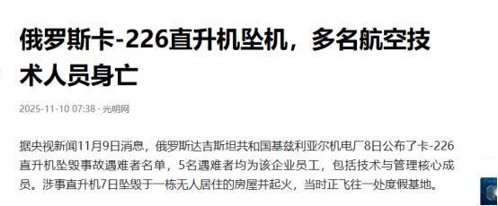 事发俄罗斯,直升机尾梁直接撞断,多名航空专家遇难! 近日,一架卡-226直升机在俄罗斯达吉斯坦共和国境内坠毁,机上5人死亡,多人是俄罗斯航空领域的专家。 了解俄罗斯航空的人都知道,卡-226直升机在俄罗斯航空体系里算不上寻常机型。 这款直升机由原苏联卡莫夫设计局研发,是双发共轴双旋翼的多用途机型,1990年首次在美国达拉斯直升机展会亮相,直到1997年9月才完成首飞任务,前前后后花了七年时间打磨。 作为卡-26直升机的后续改进型号,它在机头设计、垂直尾翼结构和乘客舱布局等关键地方都做了优化,用途相当广泛,既能拉客运货、给农林作物播种,也能参与紧急救援、检查油气管线和地矿勘探,在俄罗斯航空工业里确实称得上“多面手”。 这次坠毁的直升机隶属于俄罗斯基兹利亚尔机电厂。11月8日,该厂公布了遇难者名单,机上人员的具体身份随之公布,每一位遇难者都是俄罗斯航空领域的资深从业者。 基兹利亚尔机电厂副总经理马戈梅多夫也在其中,他全面负责企业技术研发与生产调度工作,是厂里技术和管理之间的关键衔接人物。 总工程师兼首席能源专家苏斯洛夫同样遇难,他在直升机动力系统领域钻研了几十年,卡-226好几个改进型号的发动机优化工作,都是他牵头完成的。 最让人惋惜的是直升机总设计师萨阿杜耶夫,他从卡-226研制初期就全程参与,后来的升级改进也没落下,对这款机型的结构设计、性能提升掌握得极为透彻,说是这款机型的“灵魂人物”也不为过。 另外,经验丰富的驾驶员贾布拉伊洛夫和机械师苏罗夫也没能幸免于难,苏罗夫事故后被紧急送进医院抢救,但最终还是没能留住性命。 事故发生的整个过程既惊险又让人痛心。当时这架卡-226正飞行在达吉斯坦共和国的山区上空,这片区域位于北高加索东部,大高加索山脉的山麓纵横交错,地形本来就复杂。 根据初步调查结果,直升机在飞行过程中,发动机突然起火,火焰很快就蔓延到机身结构。驾驶员贾布拉伊洛夫立刻尝试操控直升机紧急迫降,他凭着多年积累的飞行经验,成功避开了下方陡峭的山体,但已经失控的机身在下降过程中开始剧烈晃动。 现场目击者说,直升机的尾梁就在晃动中被直接撞断,失去平衡的机身直直砸向地面,紧接着就燃起了大火,火光在山区上空看得很清楚。 事故发生后,俄罗斯紧急情况部的救援队伍迅速赶赴事故现场。山区的崎岖山路给救援车辆通行造成了很大阻碍,救援人员只能在部分路段下车徒步前进,等他们赶到坠毁地点时,直升机残骸已经被大火烧得只剩一半。 救援人员顶着高温和浓烟开展搜救行动,最终确认机上5人全部遇难,没有找到生还者。他们小心地清理现场的残骸,把遇难者遗体妥善安置好,同时收集散落在现场的零部件,这些零件会作为后续事故调查的关键证据。 目前,俄罗斯相关部门已经对这起事故立案调查,除了已经确认的发动机起火这个原因,技术人员还在排查其他可能因素,比如零部件是否老化、日常维护有没有做到位,还有当时的天气是否产生了影响。 这起事故给俄罗斯航空工业造成的冲击体现在多个方面。从技术角度来说,萨阿杜耶夫、苏斯洛夫这些核心专家的离世,直接让卡-226后续的升级改进计划停了下来,相关技术传承也面临断裂风险。 基兹利亚尔机电厂是生产卡-226的重要企业,马戈梅多夫的去世让企业技术管理体系出现了空缺,要在短时间内找到能接替他的人并不容易。 要知道,卡-226现在是俄罗斯轻型直升机里的主力机型,在不少领域都在广泛使用,还出口到了好几个国家和地区,不管是后续的维护升级还是技术改进,都离不开这些核心人才的支撑。 从整个行业的角度来看,这起事故也促使俄罗斯航空领域重新审视安全管理工作。 卡-226从2004年正式交付使用到现在,整体安全记录一直不错,但这次事故造成了多名核心专家遇难,后果严重,自然引发行业内部的高度警觉。 俄罗斯航空管理部门已经要求所有使用卡-226的单位,全面开展安全检查工作,重点检查发动机系统的运行状态和零部件老化情况,同时还要加强飞行员的应急处置培训,就是为了避免再发生类似的悲剧。 达吉斯坦共和国当地民众得知这起事故的消息后,纷纷以不同方式表达哀悼。 不少人自发来到事故现场附近,摆放鲜花和蜡烛,以此缅怀遇难的专家们。当地政府也表示,会为遇难者家属提供全方位帮扶,帮他们解决生活中遇到的实际困难。俄罗斯航空领域的多家企业和科研机构,也陆续组织了悼念活动,缅怀这些为俄罗斯航空事业付出很多的技术人员。