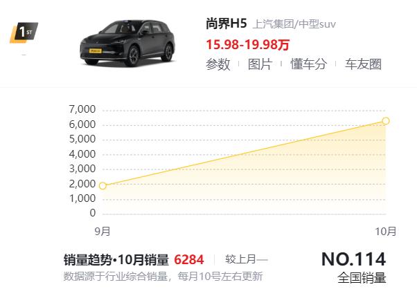 近日,10月份尚界H5销量出炉,达6284辆,相比9月份销量1901辆增幅不小,