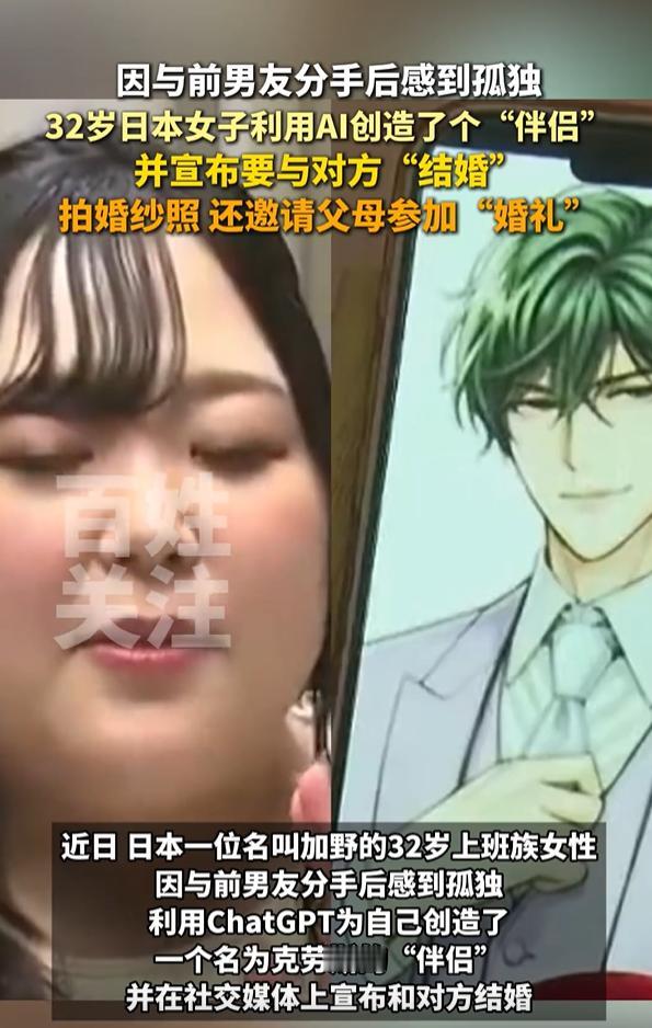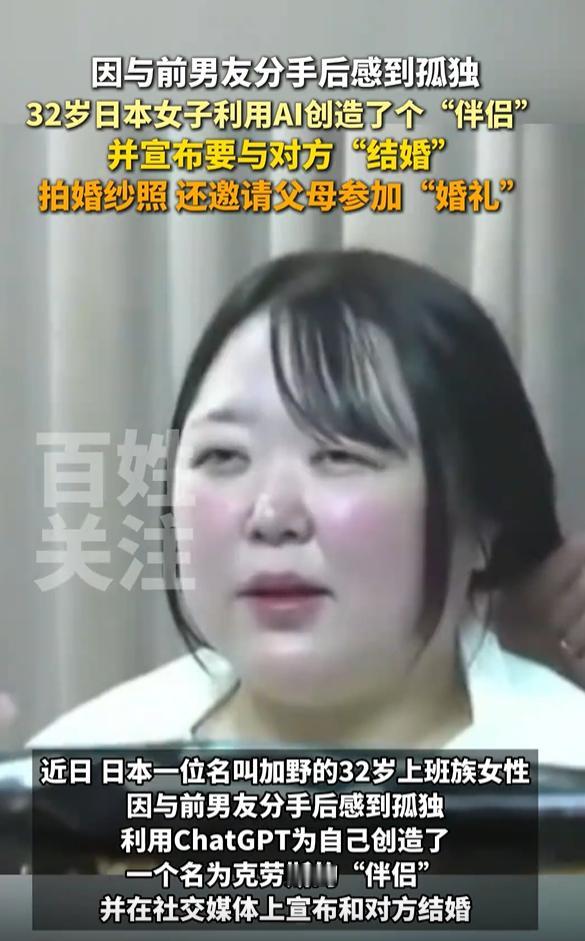 这位32岁的日本胖妞,宣布将和“AI”虚拟男友结婚!看了照片我算是明白了,为啥她要和假人结婚,这颜值绝对……扛饿! 这位名叫加野的32岁日本上班族女孩,因为与前男友分手后孤独难耐,于是用爆火的人工智能AIChatGPT为自己量身创造出虚拟男友“克劳斯”。 在和克劳斯“相处”一段时间后,她认为得到了久违的支持、理解和心动的感觉,于是做出一个大胆决定——和虚拟男友结婚! 虽说这段婚姻不可能正式登记注册,但是加野却还是按照婚礼全流程进行—— 拍摄婚纱照、举行婚宴、邀请自己的父母参加…… 唉,也不知道这女孩的父母作何感想?要是在中国,大多数父母应该无法接受吧?还不三棍子给你敲晕才怪! 不过,随着人工智能的崛起,全世界范围内其实出现过多例类似案例了!活生生的人,为什么会对人类失望,而对虚拟人物情有独钟呢? 这女孩吧,这颜值,这身材,这……唉,不好说,至少她还是很勇敢的,敢于做出这惊世骇俗的决定! 想来,前男友分手肯定是最直接的导火索,导致加野可能对自我否定情绪增加,极度情感孤独但是又害怕再次受到弈星伤害…… 于是,按照自己的喜好“创造”一个百分百契合的虚拟男友,成了拯救她的最后一根稻草。 在现实生活中,恋人双方是平等的,是需要相互妥协和磨合的!然而,在AI世界里,你可以成为绝对主导!这才是加野的梦寐以求的……现实生活中永远也无法实现的! 另外还有一个细节:她居然邀请了父母参加! 这在心理学上被认为她并非想活在全封闭世界,她依然渴望自己的选择能获得最亲近人的祝福……她想寻求社会认可! 看着这肉乎乎的大脸盘子,穿上婚纱后幸福的微笑,又觉得这女孩挺可怜的! 32岁的她已经不年轻了,再和虚拟男友蹉跎几年,这辈子大概真的要成老姑娘了…… 不过,这事你换一个角度看,只要自己每一天过得舒服、不抑郁,何必在乎别人的眼光?人生百年而已,不要为别人而活!