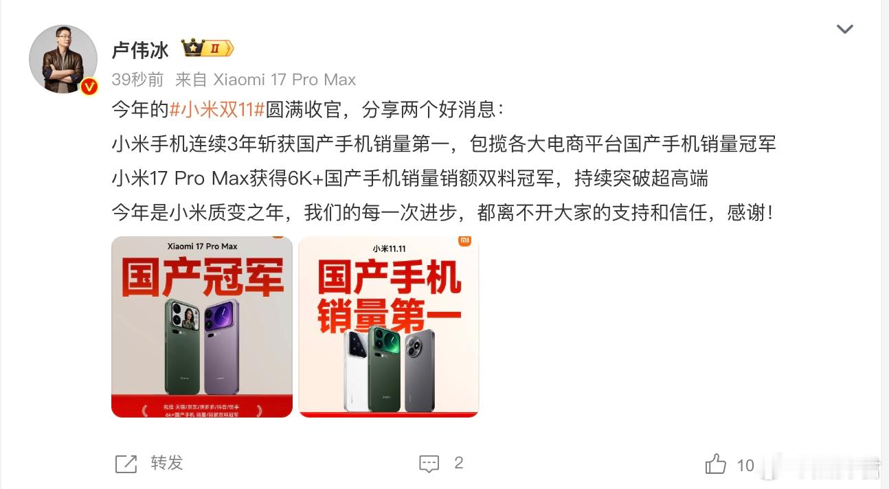 央妈《消费主张》报道小米17凭借背屏,影像,续航获得大量年轻人青睐,看了一下双十一的数据,小米已经连续三年蝉联国产手机销量第一了,全渠道累计支付金额达290亿,小米17牛逼啊,又一个爆品!让小米在自己的主阵地稳住了!