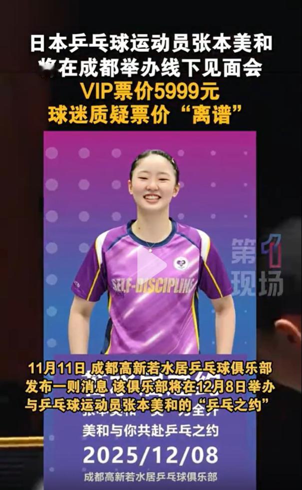 张本美和在成都捞钱?见面会票价5999元一张!要是她哥来的话,可能有戏!当面问问他为啥每次打中国队都鬼哭狼嚎? 今年6月,成都高新若水居乒乓球俱乐部官宣张本美和正式加盟俱乐部,将随队征战2025中国乒乓球俱乐部超级联赛。 11月11日,该俱乐部宣布,将在12月8日推出“张本美和见面会”,三种门票价格:99元、599元和5999元。 喜欢乒乓球的和不喜欢乒乓球的,大概都对张本智和兄妹俩“爱恨交织”,尤其是哥哥张本智和…… 这小子一打中国队就来劲,上场鬼哭狼嚎的吵死个人,一旦能赢中国队,他简直是从眼神到全身都使出“挑衅”的劲头,让人看了很不舒服! 如今他妹妹要来中国联赛了,而且还是其老家成都的俱乐部。 说老实话啊,作为一名成都市民,总感觉这事不得劲,说不出来的一股子感觉,似乎是排斥多于期待! 大家觉得不?张本美和尽管长相甜美,也时常脸上挂着笑容,但是这女孩怎么越来越像日本人? 她身体里可是留着中国人的血液啊,然而十多年的潜移默化,这小孩几乎是从头到脚日本化了,给人的第一眼感觉就不像是川妹子! 这一次俱乐部搞出个“乒乓之约”见面会,预热一下氛围也没啥问题,但是整出个5999元一张的VVIP门票,就有点离谱了。 据说吧,这天价门票的福利很多,甚至包括和张本美和共进午餐……这意思,感觉是把张本美和当成巴菲特了? 如果是她哥张本智和的话,说不定还火爆一些! 倒不是说人们更喜欢张本智和,而是真心想近距离和这小伙子唠唠嗑——你说你打中国人,为什么喜欢嚎?你嚎个什么劲儿?