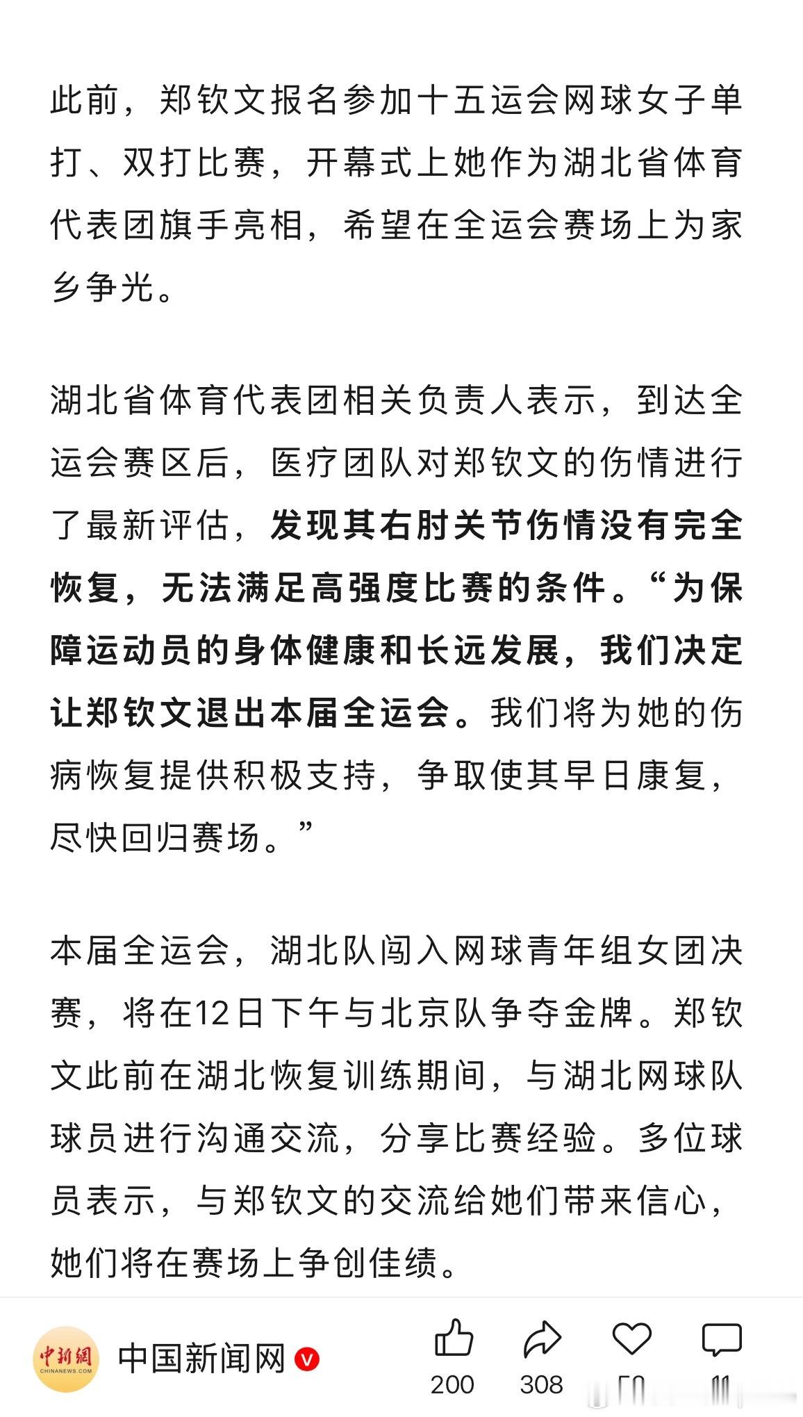 湖北省体育代表团相关负责人表示,到达全运会赛区后,医疗团队对郑钦文的伤情进行了最新评估,发现其右肘关节伤情没有完全恢复,无法满足高强度比赛的条件。“为保障运动员的身体健康和长远发展,我们决定让郑钦文退出本届全运会。我们将为她的伤病恢复提供积极支持,争取使其早日康复,尽快回归赛场。”(中国新闻网)