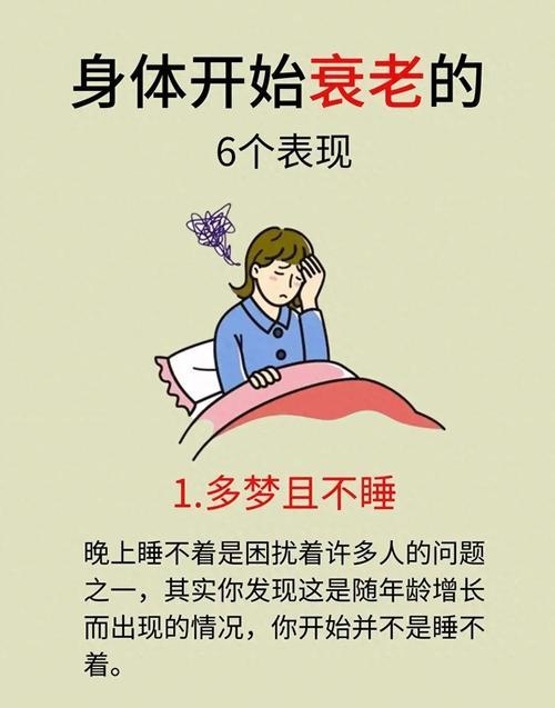 身体出现5个信号,可能衰老已来临 1. 睡眠质量下降,入睡难、易醒;2. 记忆力减退,常忘事、反应变慢;3. 皮肤状态变差,皱纹增多、弹性下降;4. 精力不足,稍活动就疲惫;5. 代谢变慢,体重上升且难控制。若出现这些信号,建议及时调整作息、坚持运动,延缓衰老进程。中老年睡眠差 衰老