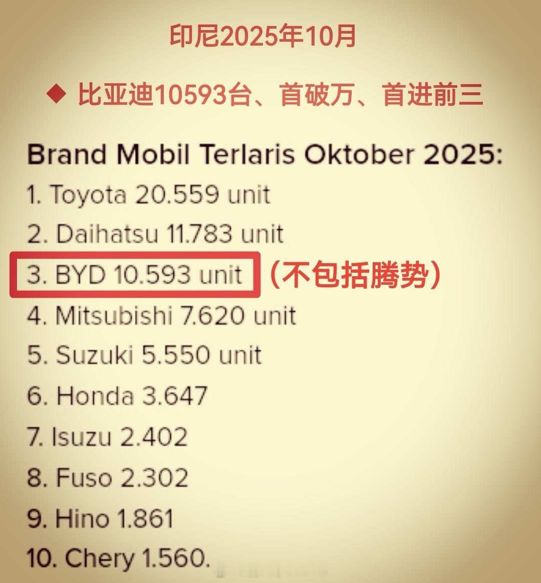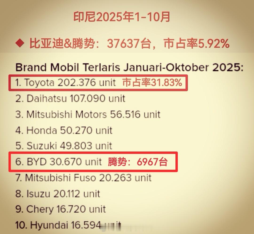 印尼◆ 10月销量10593台(不包括腾势)、首破万、首进前三◆ 1-10月销量(包括腾势)37637台,市占率5.92%印尼市场老大哥仍是丰田,市占率高达31.83% !ps:截止目前,比亚迪在印尼售卖车型全为纯电!