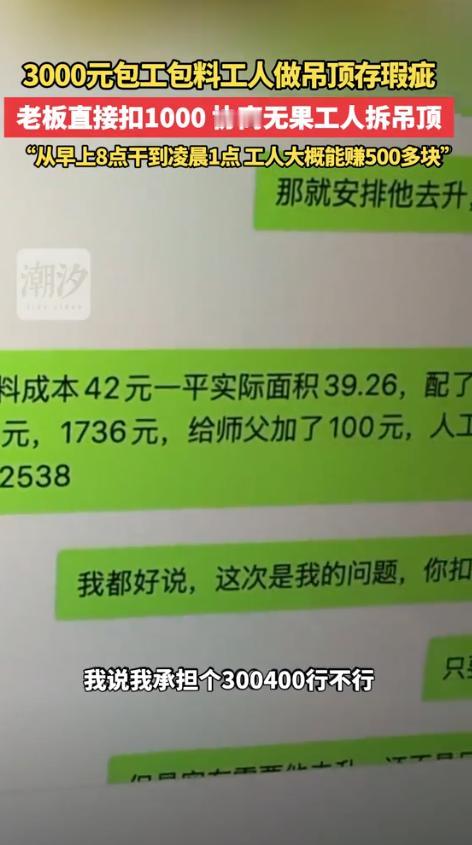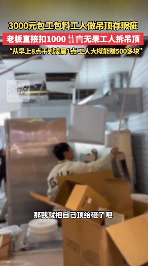 “太缺德了!”湖北武汉,一老板找人做吊顶,谈好了3000元包工包料,工人从早上8点一直忙到凌晨1点才做完,可结账时,老板却说做的不合适,坚决要扣1000元,工人气不过,将装好的吊顶全拆了。网友:太欺负人了! 据潮汐视频11月12日报道,湖北武汉,一家准备开业的生鲜超市里,喻先生带着两个工友,正在为3000块钱的吊顶工程忙碌着。 这是他们通过朋友介绍接的活,包工包料,利润微薄,除去材料成本,三个人辛苦一天,到手也就五百来块钱。 但对于指望这份收入养家糊口的他们来说,再小的活也得认真干,为了不耽误店主陈先生的开业计划,三人从早上八点就进了场。 他们一刻不停地测量、切割、安装,午饭也是匆匆扒拉几口盒饭就继续干,期间,店主陈先生来过两次,每次都只是催促进度,对于施工质量并没有提出任何意见。 工人们心里只有一个念头,就是尽快完工,拿到应得的辛苦钱,时间一分一秒过去,从白天到黑夜,整整17个小时的高强度劳作,直到第二天凌晨一点,整个吊顶工程才终于结束。 喻先生仔细地将现场打扫干净,把所有建筑垃圾打包清运出去,然后拍下平整干净的吊顶照片,通过微信发给了店主陈先生,满心以为可以顺利结款回家休息了。 然而,他等来的回复却像一盆冷水浇在头上,陈先生发来消息,声称吊顶的拼接处有缝隙,不好看,以此为由要扣掉1000元,只肯支付2000元。 这个理由让喻先生无法接受,所谓的缝隙不过两三毫米,不凑近仔细看根本发现不了,完全在正常的施工误差范围内,更不影响任何使用功能。 喻先生立刻打电话过去协商,表示可以马上返回现场进行调整,直到对方满意为止,可陈先生的态度十分强硬,不给任何商量的余地,直接拒绝了返工的提议,并挂断了电话。 当喻先生想再次通过微信沟通时,却发现自己已经被对方拉黑了,凌晨的街头,寒风刺骨,三个大男人蹲在超市门口,心里比天气更冷。 他们想不通,自己付出了17个小时的辛勤劳动,换来的却是对方如此蛮横的克扣,这1000块钱,几乎是他们这单活全部的利润加上一半的材料成本。 辛辛苦苦一场,不仅一分钱没赚到,还要自己倒贴钱,这口气实在咽不下去,在多次沟通无果,并且被单方面切断联系后,一种屈辱和愤怒的情绪在三人心中蔓延。 他们觉得,钱可以不要,但不能让对方如此轻易地占有他们的劳动果实和他们自己花钱买来的材料。 于是,一个极端的念头产生了,凌晨三点,三人返回超市,拿起工具,将刚刚安装好的吊顶一块一块地拆了下来,然后将拆下的材料整齐地码放在店门口,默默地离开了现场。 第二天一早,店主陈先生来到店里,看到满地狼藉的景象,气急败坏地选择了报警,这起由1000元扣款引发的纠纷,最终演变成了一场两败俱伤的闹剧。 回过头来看整件事,其实暴露了许多现实中的问题,对于喻先生和他的工友来说,他们是典型的老实巴交的劳动者,相信只要自己踏实肯干,就能换来应得的报酬。 然而,现实却给了他们沉重一击,当遭遇不公时,由于缺乏有效的沟通渠道和法律意识,他们选择了最原始、最冲动的反抗方式,虽然解了一时之气,却让自己从有理变成了没理,陷入了更大的麻烦之中。 而对于店主陈先生,他的行为则是一种典型的精致利己主义,他利用了双方没有签订正式合同的漏洞,拿捏住了农民工群体维权难的软肋,试图用一种强硬的姿态为自己谋取不当利益。 他或许认为自己很聪明,能省下1000块钱,但他没有算到,这种对他人劳动毫无尊重的行为会激起多大的反弹,最终导致自己的店铺无法按时开业,蒙受了远超1000元的经济损失,更在道义上输得一败涂地。 这场冲突里没有真正的赢家,它像一面镜子,照出了当下社会一些人与人之间信任的缺失和对规则的漠视。 如果当初双方能签订一份简单的书面协议,明确验收标准和付款流程,如果在产生分歧后,双方能平心静气地沟通,而不是一个蛮横克扣,一个冲动拆毁,事情本不至于此。 这件事也给所有人提了个醒:在这个社会上,无论是谁,尊重规则、尊重他人劳动,都是最基本的底线。 靠小聪明和强硬手腕去占便宜,最终只会反噬自己,而对于所有靠双手吃饭的劳动者来说,更要学会用法律和智慧来保护自己,别让自己的血汗白流。 信源:潮汐视频2025-11-12——工人3000包工包料装修吊顶存在瑕疵,结果没赚钱还要赔500,协商无果后拆掉吊 顶!