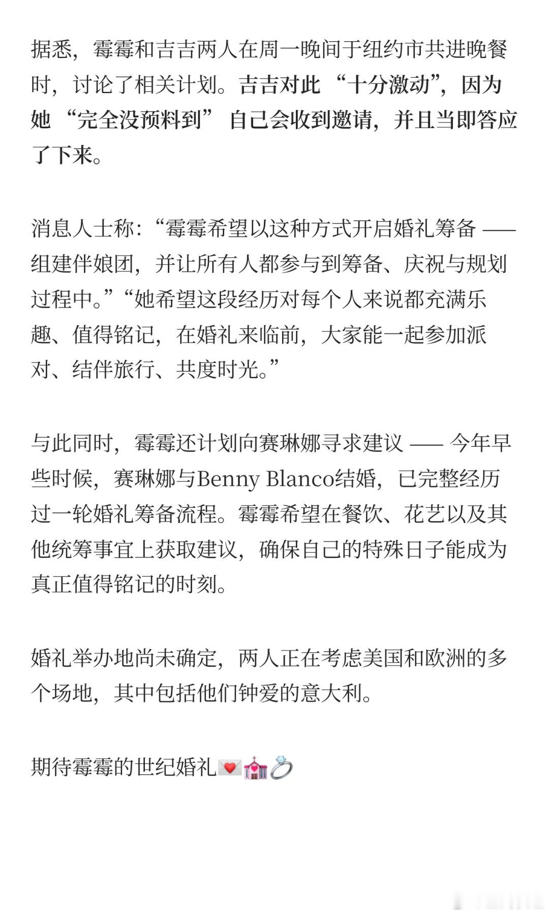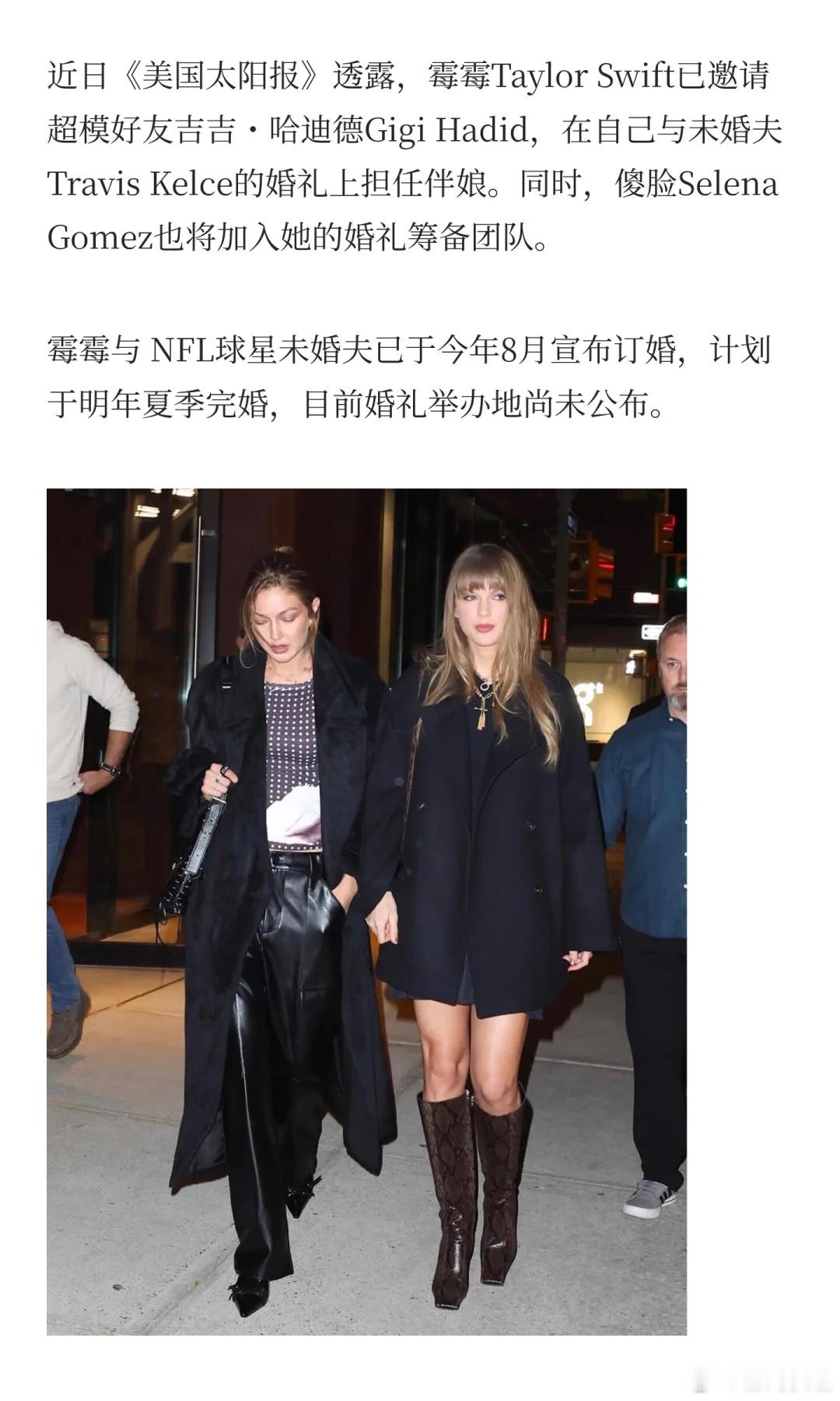 《美国太阳报》透露,霉霉Taylor Swift已邀请超模好友Gigi Hadid,在自己与未婚夫Travis Kelce的婚礼上担任伴娘。同时,傻脸Selena Gomez也将加入她的婚礼筹备团队!期待霉霉的世纪婚礼!