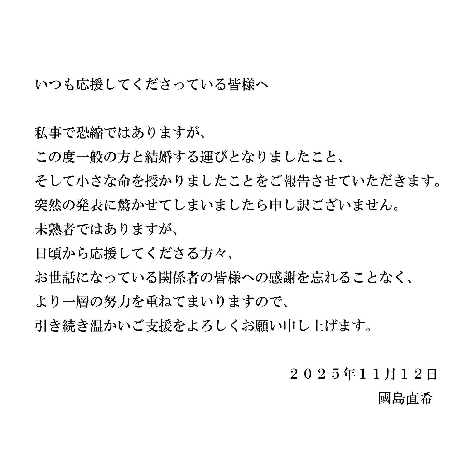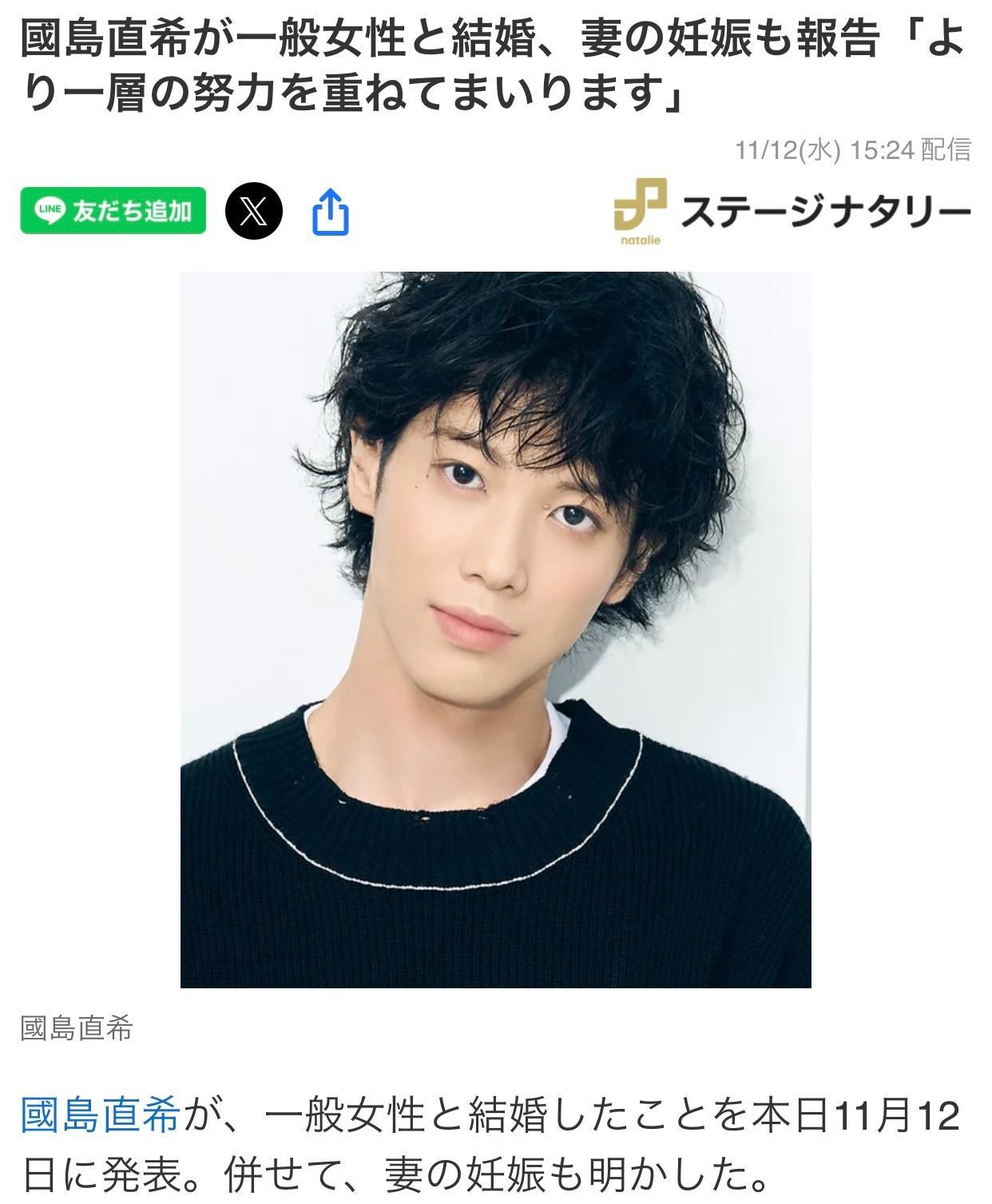 12日,日本演员国岛直希在社交平台宣布与圈外女友结婚,并透露女方已怀孕。据悉,国岛直希于2016年凭借出演特摄剧《动物战队兽王者》,由此实现电视剧出道。
