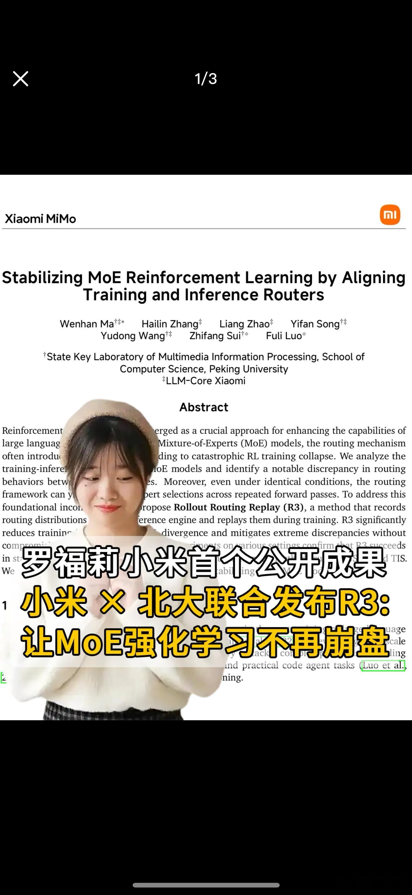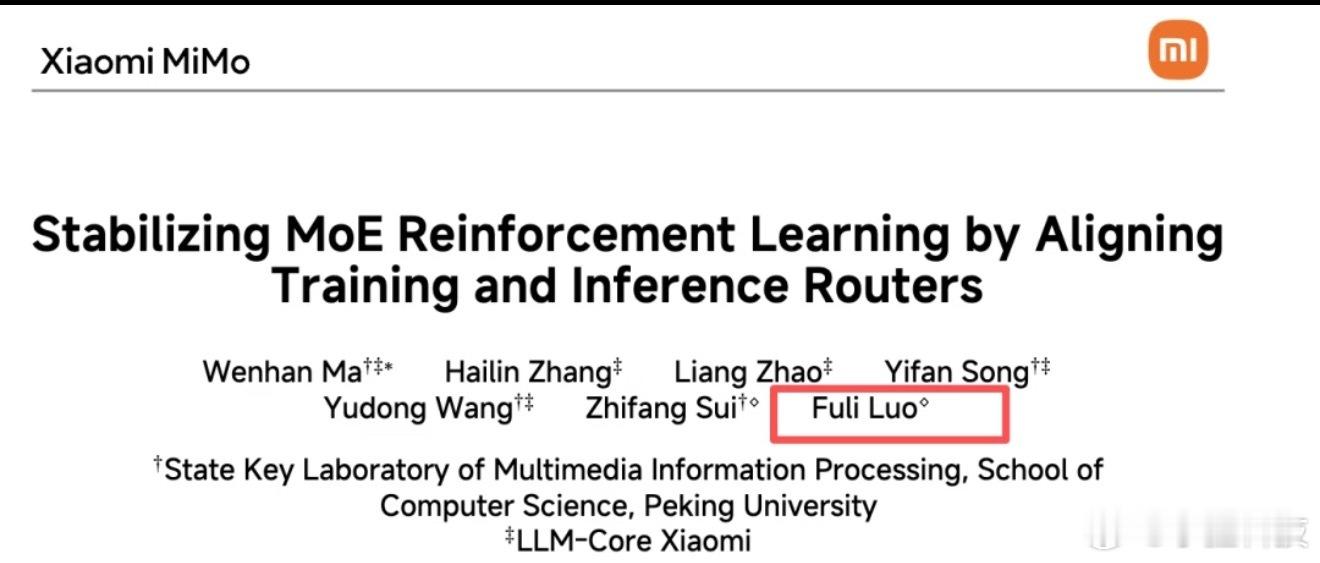 之前这位天才少女亮相了一篇顶级论文,提出了一种名为 **R3(Rollout Routing Replay)** 的创新方法,成功解决了MoE大模型在强化学习中的路由不稳定问题,训练效率提升显著!未来的小米手机、智能家居、自动驾驶,都可能用上这项黑科技!科技大厂之间AI军备竞赛已经打响了,罗福莉的加入应该会让小米在AI领域的布局更加完善和强大。