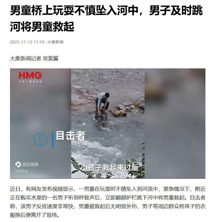 男子绝对是见义勇为,不仅孩子家长要表示感谢,政府有关部门也要隆重表彰!在四川,一个男孩和一个女孩在桥上玩耍时,男孩突然从桥上翻越栏杆掉了下去,被水流冲向远处。一男子发现后急忙下去把孩子捞了起来,幸好没造成重大伤害。小伙子反应非常机敏,要为他点赞!同时也提醒家长,一定要看护好孩子,教育孩子要远离危险,千万不要在河边特别是桥上玩耍,否则很容易出现危险。从这么高的桥上掉到水里,无论是摔坏还是被水淹都是不得了的事情。真是不幸中的万幸!