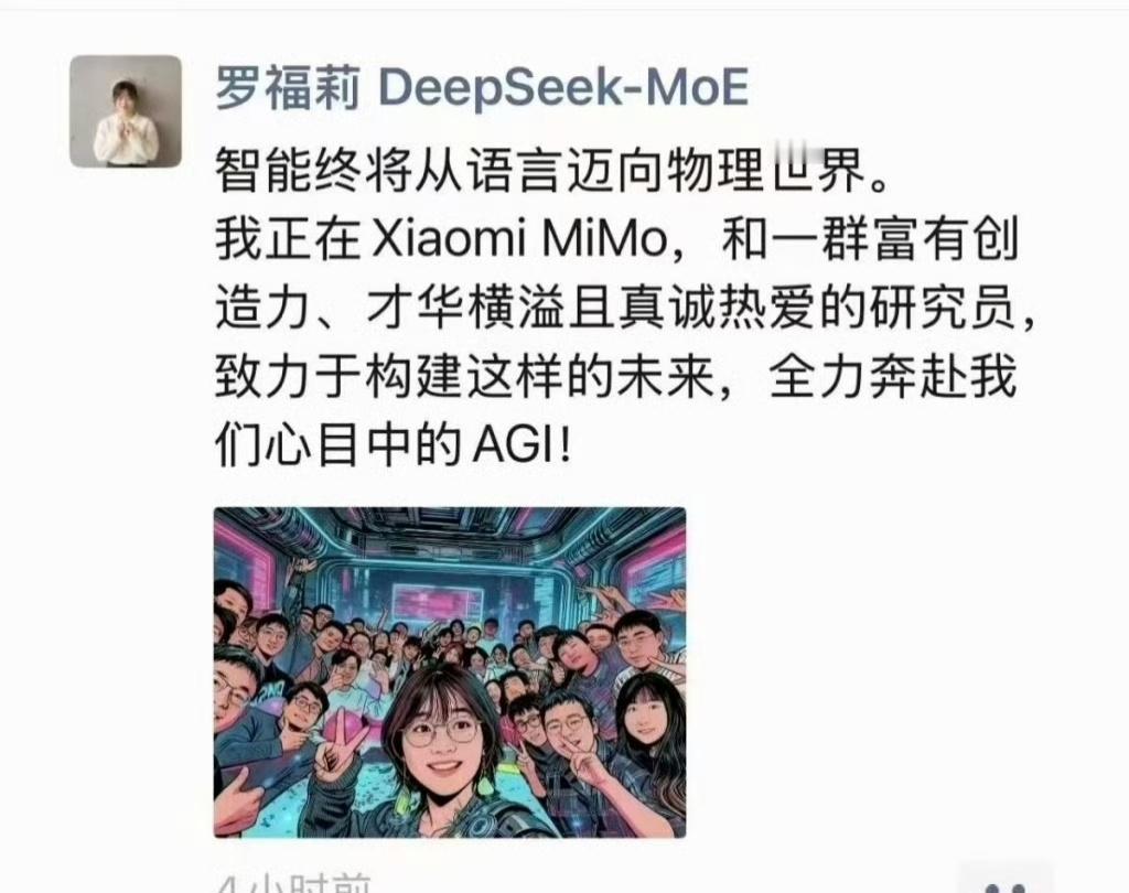 有两个信息:从照片看是在C位,所以应该是部门负责人类似的职位。另外,从“智能终将从语言迈向物理世界”的描述看,应该是要聚焦智驾了。而且人家本来就是DeepSeek做大语言模型的,在小米很可能是做小米的VLA。