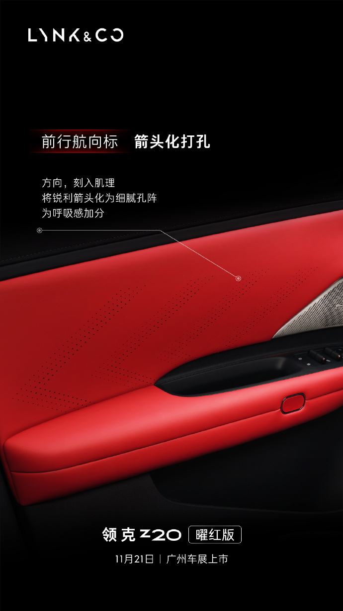 还在为2026年的开运神器发愁?领克Z20曜红版给你答案,超跑同款烈焰红内饰,每处细节都暗藏玄机,直接给座舱的氛围感套上一层高光滤镜,不是波尔多红买不起,而是耀红更有性价比!玩细节你可以永远相信领克,玩红色当然也可以!11月21日广州车展,Z20曜红版上市,小本本记好日期,准备启动你的好运引擎吧。