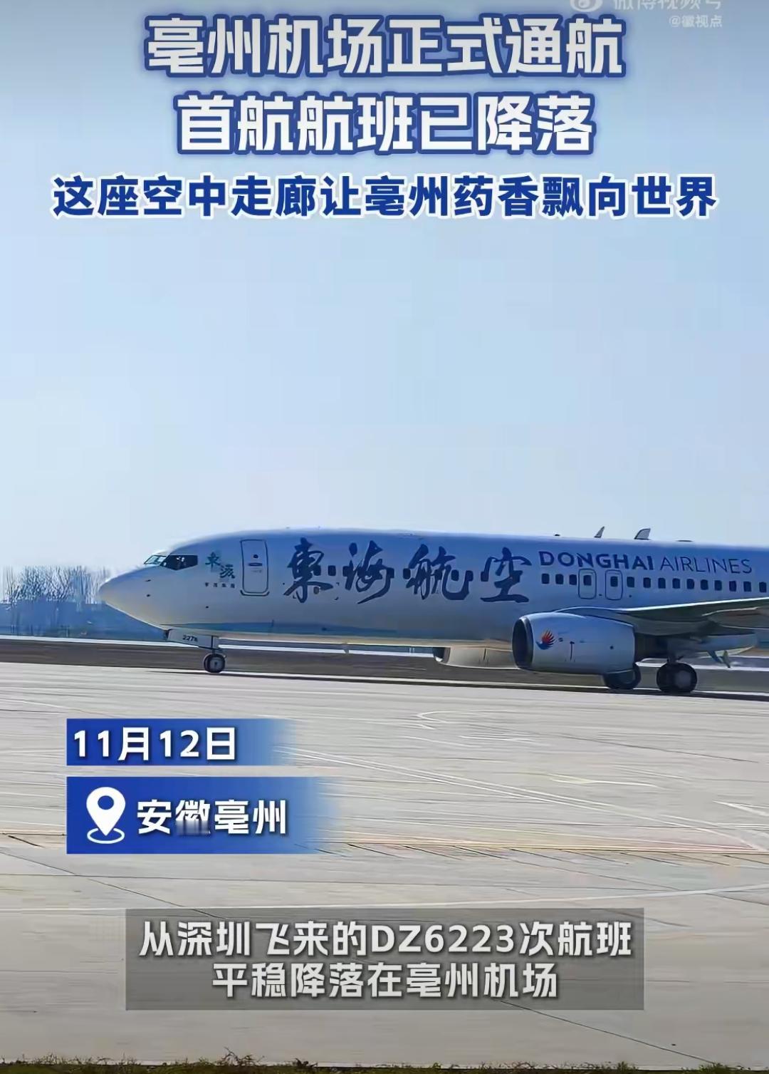 亳州比苏州更早通航民航客机! 11月12日亳州机场正式通航!意味着这个四线城市拥有了属于自己的民航机场! 从深圳飞来的DZ6223次航班平稳降落在亳州机场,机场以民航最高礼遇“水门仪式”迎接首批乘客与机组人员,现场气氛热烈。 说起这个城市全国大多数网友不太熟悉,这个就是大家经常看到的那个广告“古井贡酒”的产地,也是全国知名的中医药集散地。 各位是怎么看的?欢迎评论区留言。