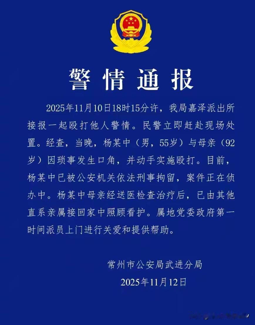 2025年11月10日傍晚,常州武进区的监控拍下揪心一幕:55岁的杨某中对着92岁母亲陈某琴连扇耳光,揪住花白头发拽倒在地,老人哭喊“我错了别打了”,他仍追进厨房踢踹,打完竟淡定回桌喝酒吃菜。 老人女儿早发现母亲身上有多处不明瘀伤,追问后得知长期遭哥哥殴打,无奈悄悄装监控取证,当天通过监控看到暴行后,立刻联系邻居并报警,爆料事发因母亲做饭多放了盐、反复问开销引发冲突。 11月12日常州警方通报,杨某中已被依法刑事拘留,案件正侦办。老人经送医检查,脸颊红肿、嘴角破损、腿部淤青,目前由其他直系亲属照料,属地政府和妇联已派专人上门提供持续帮扶。 律师解读,杨某中若被证实长期虐待母亲,将构成虐待罪;若老人伤情达轻伤以上,还涉嫌故意伤害罪,情节恶劣者最高可判处七年有期徒刑,老人可依法申请人身安全保护令。 百善孝为先,九旬老母含辛茹苦养大的儿子,竟成长期施暴者,这样的行为击穿人伦底线。你觉得该对杨某中从重处罚吗?老人后续如何避免再遭伤害?来评论区说说你的看法~ 常州老年人 常州照顾老人