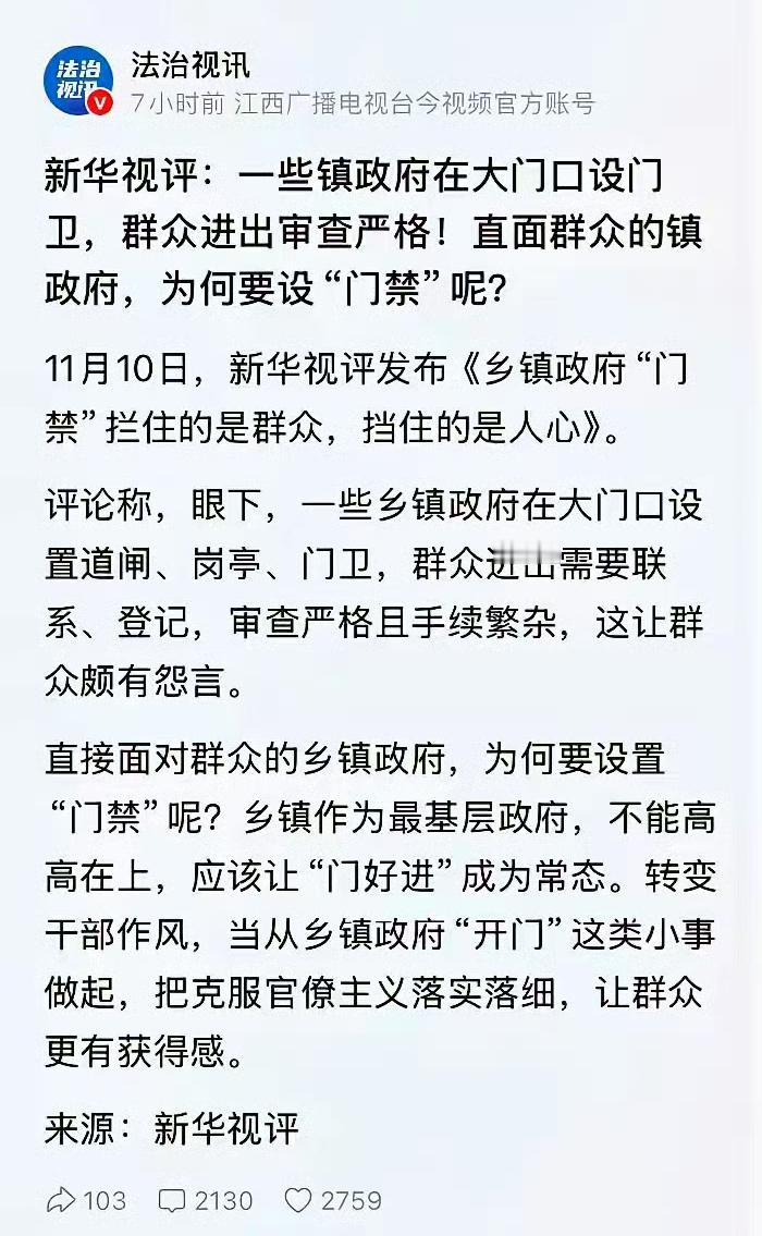 官媒批评一些乡政府设置重重关卡,人为造成和人民群众沟通障碍。现在有那个地方是没有门禁和门卫的,写字楼有,公家单位有,小区有,学校、医院就更不用说,有些地方进去还要登记身份证、手机号,过安检,这不是常态吗?反正大家已经习惯了,你不习惯就办不成事。乡里大门 湖南乡政府