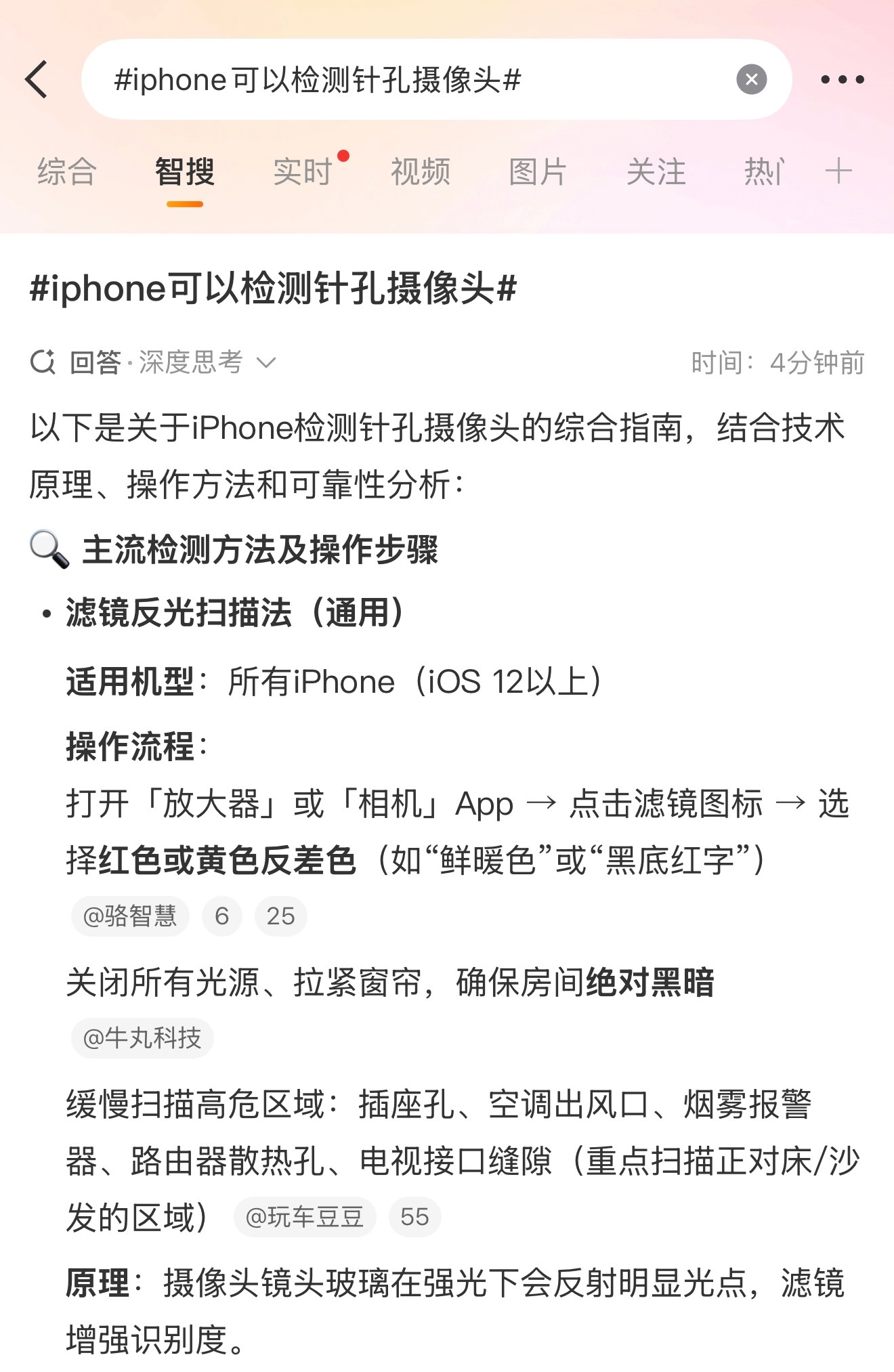 可以检测针孔摄像头的iPhone是有ToF传感器的才行,iPhone 12 Pro系列起的Pro和Max都有,iPhone Air也没有。测试方法:①打开iPhone手机的自带App:放大器②打开滤镜③选择一个偏红色或偏黄色的反差滤镜④关闭房间所有光源,把窗帘拉上,让房间暗下来⑤对着房间扫一遍反光的物体,就会显现出来重点排查:插头、空调出风口、路由器、电视、螺丝以及一些正对着床的地方