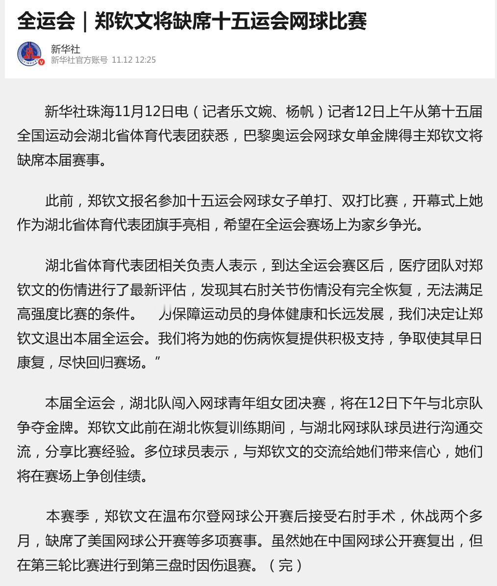 新华社报道,巴黎奥运会网球女单金牌得主郑钦文将缺席本届全运会,原因是医疗团队对郑钦文的伤情进行了最新评估,发现其右肘关节伤情没有完全恢复,无法满足高强度比赛的条件。接下来小郑将进入冬训期和康复期。静候满血归来,新赛季见💪