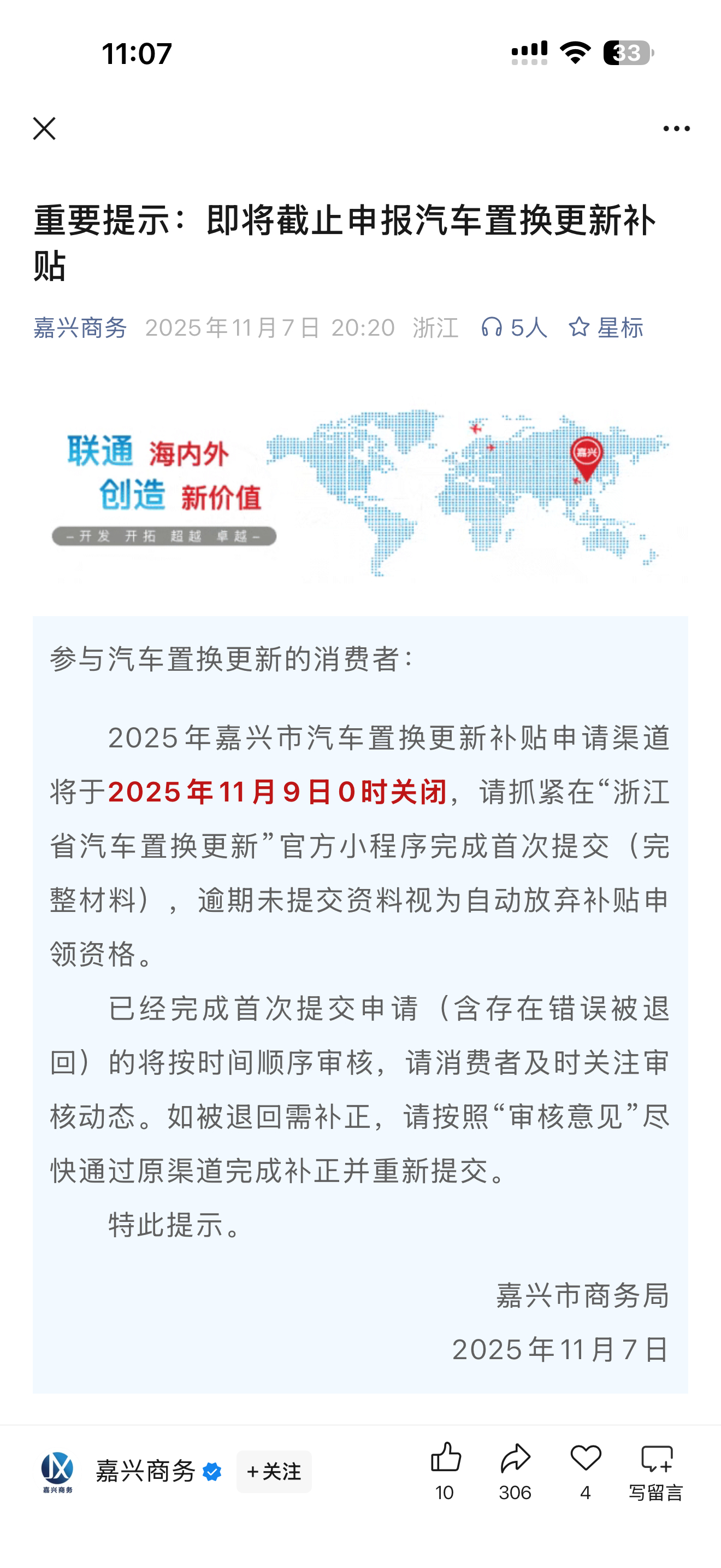 今年浙江各地的汽车置换补贴、报废补贴都陆续暂停了。我的尚界H5也算是赶上趟了