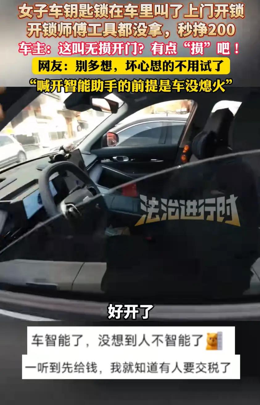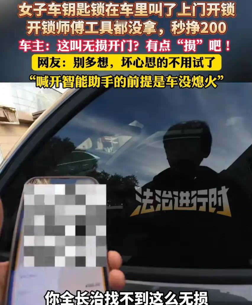 山西长治,女子停车后不小心把车钥匙锁在了车里,无奈之下找来开锁师傅,师傅看了一眼,表示要先付款200,绝对无损开车,女子二话不说就扫码转钱,可下一秒,师傅就通过语音喊话,让车机自己把车窗打开,女子当场懵了:这叫无损开门?我看是有点“损”吧! 原来,这位女士停车购物时一时疏忽,将车钥匙遗落在驾驶座上,关车门的瞬间才发现车门自动落锁,望着紧锁的车窗,她顿时手足无措。 情急之下,女子通过朋友推荐联系到一位开锁师傅,对方承诺“无损开锁,十分钟到位”,报价200元。想着能快速拿回钥匙且不损伤车辆,女子毫不犹豫地答应了条件。不久后,开锁师傅抵达现场,围着车辆转了一圈,既没拿出专业工具,也没进行任何拆卸操作,只是抬头对女子说了句“先付款吧,付完马上开门”。 女子虽有些疑惑,但想着师傅大概率是胸有成竹,便二话不说扫码转账200元。令人意想不到的是,付款成功的下一秒,师傅对着车机系统大声喊出“打开车窗”,原本紧闭的车窗竟缓缓降下。这一幕让女子当场愣住,愣了几秒后哭笑不得地说道:“这叫无损开门?” 其实,女子的车辆支持语音控制功能,她自己情急之下完全忘了这项配置,而经验丰富的开锁师傅一眼便识破了玄机。女子表示,不是心疼200元,而是这种开锁方式实在让人意外。 网友:“师傅这是靠眼力赚钱”“200元买个语音指令,确实有点亏”,也有网友表示“花钱买个教训,下次肯定不会忘”。