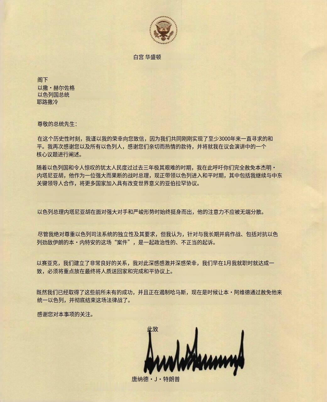 美国总统特朗普致信以色列总统艾萨克·赫尔佐格,请求其赦免因腐败罪受审的以色列总理