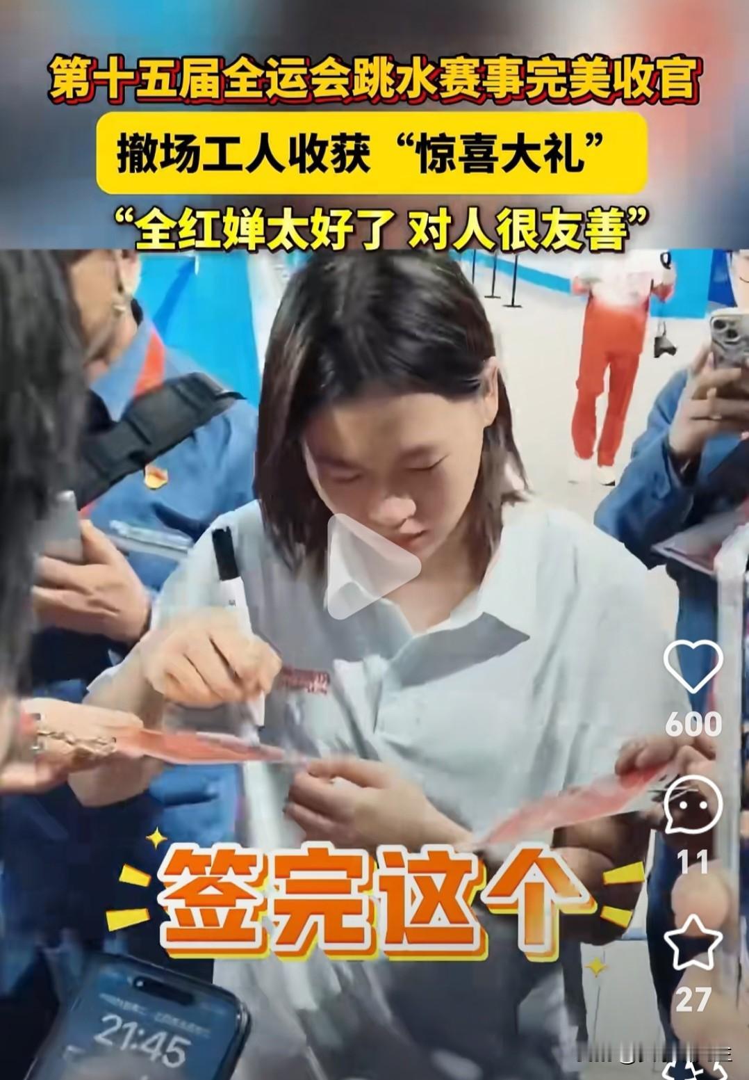 明星给粉丝签名见多了, 大牌给观众签名也不稀奇, 但看到奥运冠军全红婵蹲下来给撤场工人签名的画面,心里突然软了一下。 十五运会跳水比赛散场后,工人们正在收拾器材。他们认出全红婵,有些犹豫地凑上前问能不能签名。这个奥运冠军没有摆架子,接过工人们的工作服和入场证,低头认真签下名字。人越聚越多,她只是手上动作快了些,脸上没有一点不耐烦。递回笔的时候,她还特意把笔尖转向自己那边。 工友们拿到签名,笑得眼睛眯成一条缝。有人说这比发奖金还开心,干活都有劲了。记者在旁边不停道谢,全红婵只是摇摇头。走之前,她还转身看了看四周,挥挥手问还有没有人要签。 这时候的她,不像站在领奖台上的世界冠军,更像邻家那个懂事的小姑娘。比赛时她脚上缠满绷带,疼得皱眉却从不吭声。现在对着普通工人,她还是那份认真。这种不经意的善意,比金牌更闪亮。