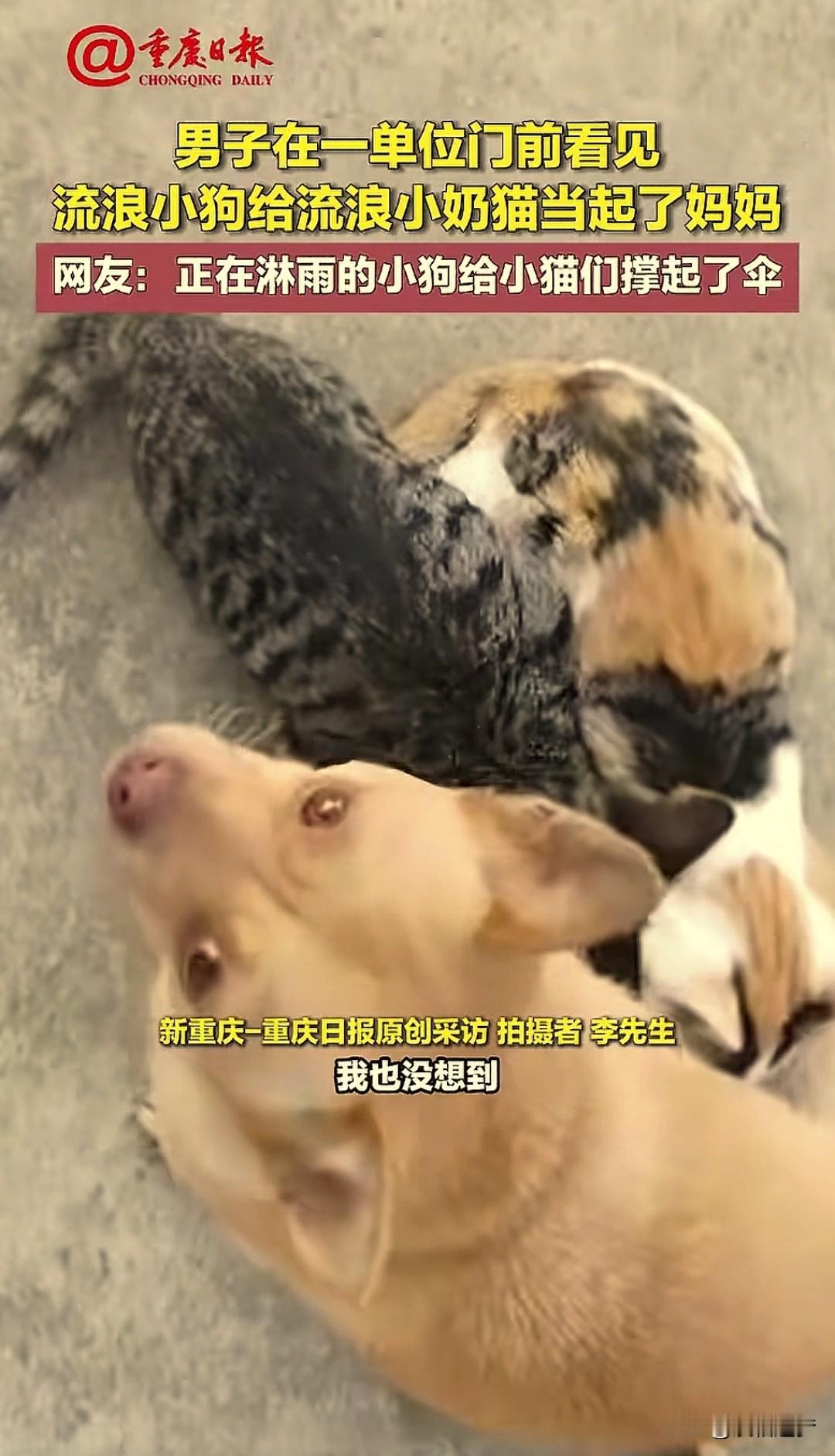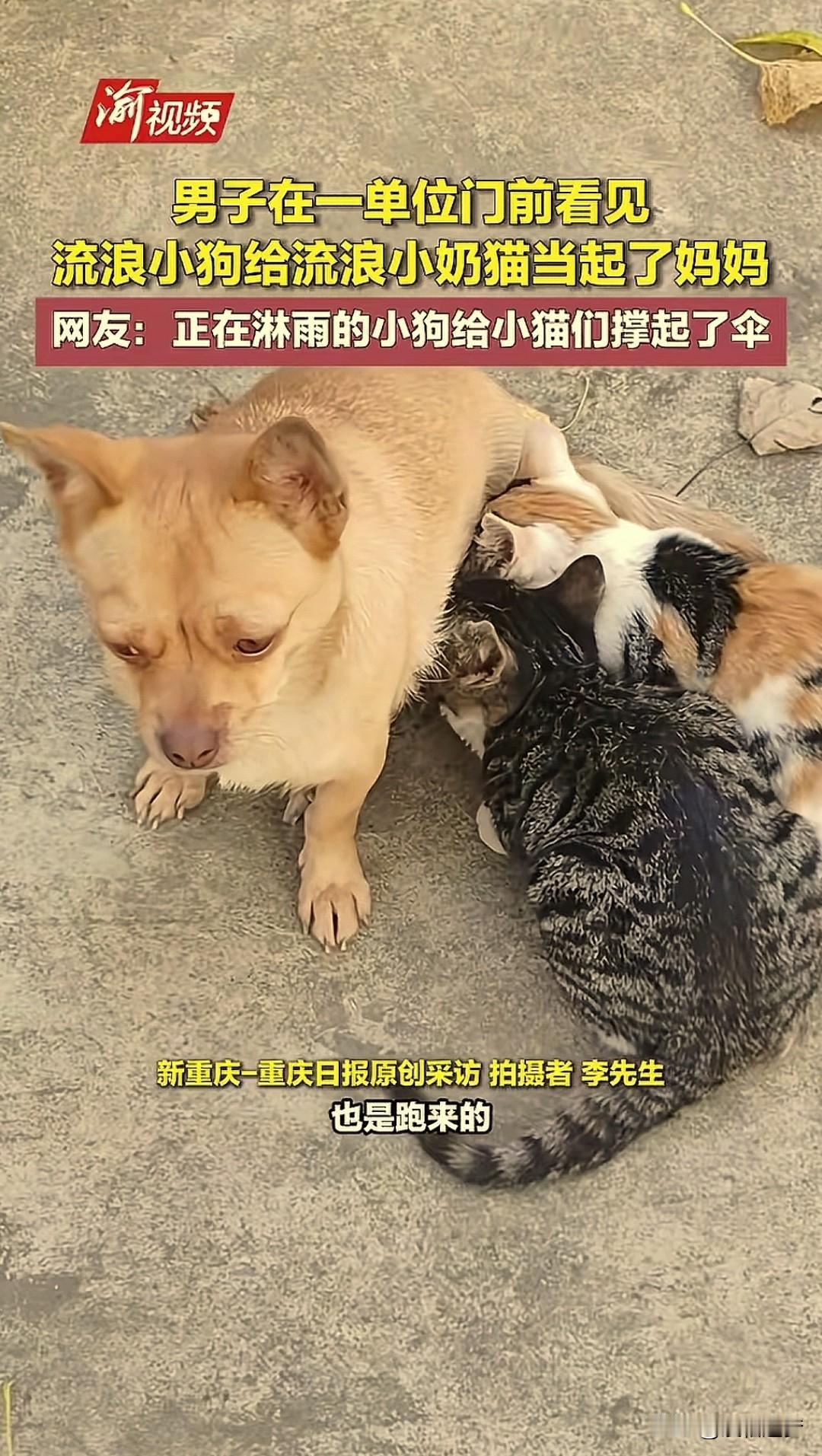 “太感人了!”河南,一男子在单位门口偶然撞见暖心又不可思议一幕:一只小狗正蹲坐在地上,哺育着两只小奶猫!动作熟练又温柔,俨然是一副亲妈模样,男子好奇又感动,拍下来就发到了网上。网友:这是跨越物种的母爱! 用“万物皆有灵”这句话来形容这三只不同物种的小动物不为过。 根据重庆日报11月11日报道,这件暖心的事,就发生在男子上班的大门口。 男子透露,当天他上班,刚到单位门口,就看到一条小型犬蹲在地上正在喂奶,原本没什么惊讶的,可男子定睛一看,吃奶的毛孩子花色居然和小狗的不一样,等他走进了才发现,竟然是两只半大的小猫咪! 男子惊讶得合不拢嘴,一眼瞧见附近的门卫大爷,细问之下才明白,原来这只小狗是流浪狗,它在两只小猫失去猫妈妈后,主动跑过来给小猫喂奶喝,要不然小猫早就挺不住了,就连大爷看到这一幕也心软了,平日里有什么好吃的也会投喂一些。 有网友看了感动的说:动物的感情非常纯粹,即便它们不是同类,也会相互帮助,一定要善待它们! 也有网友有些质疑:这两只猫看上去很大了,跟这只狗差不多大了,还需要喝奶吗? 其实,小猫半大了还没断奶,一方面是狗狗真把它们当孩子宠,也不一定有奶水了还是愿意喂给它们,还有一方面原因,小猫在外面吃不饱,等它有饭吃了,慢慢的它就不吃奶了,但是没有饭,它就只能多吃奶水。 说实话,这小狗也太有灵性了!都是流浪的毛孩子,它自己的孩子都不知去向,也都没个家,还愿意把小猫喂养大,这份跨越物种的相依为命,任凭谁看了都戳心窝子。 也多亏了门卫大爷愿意投喂它们,不然这仨小家伙日子更难。